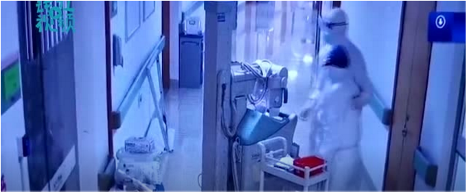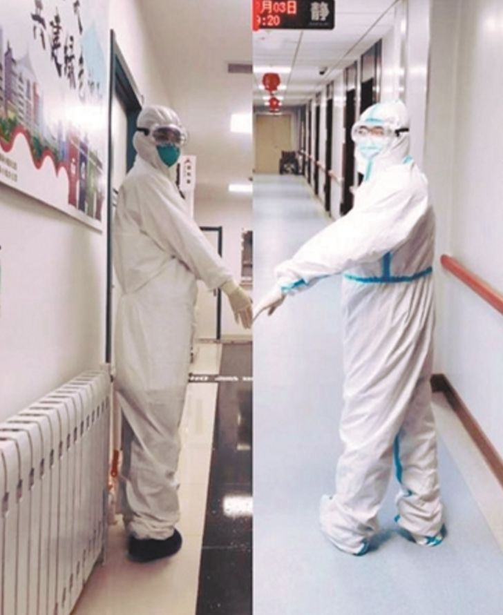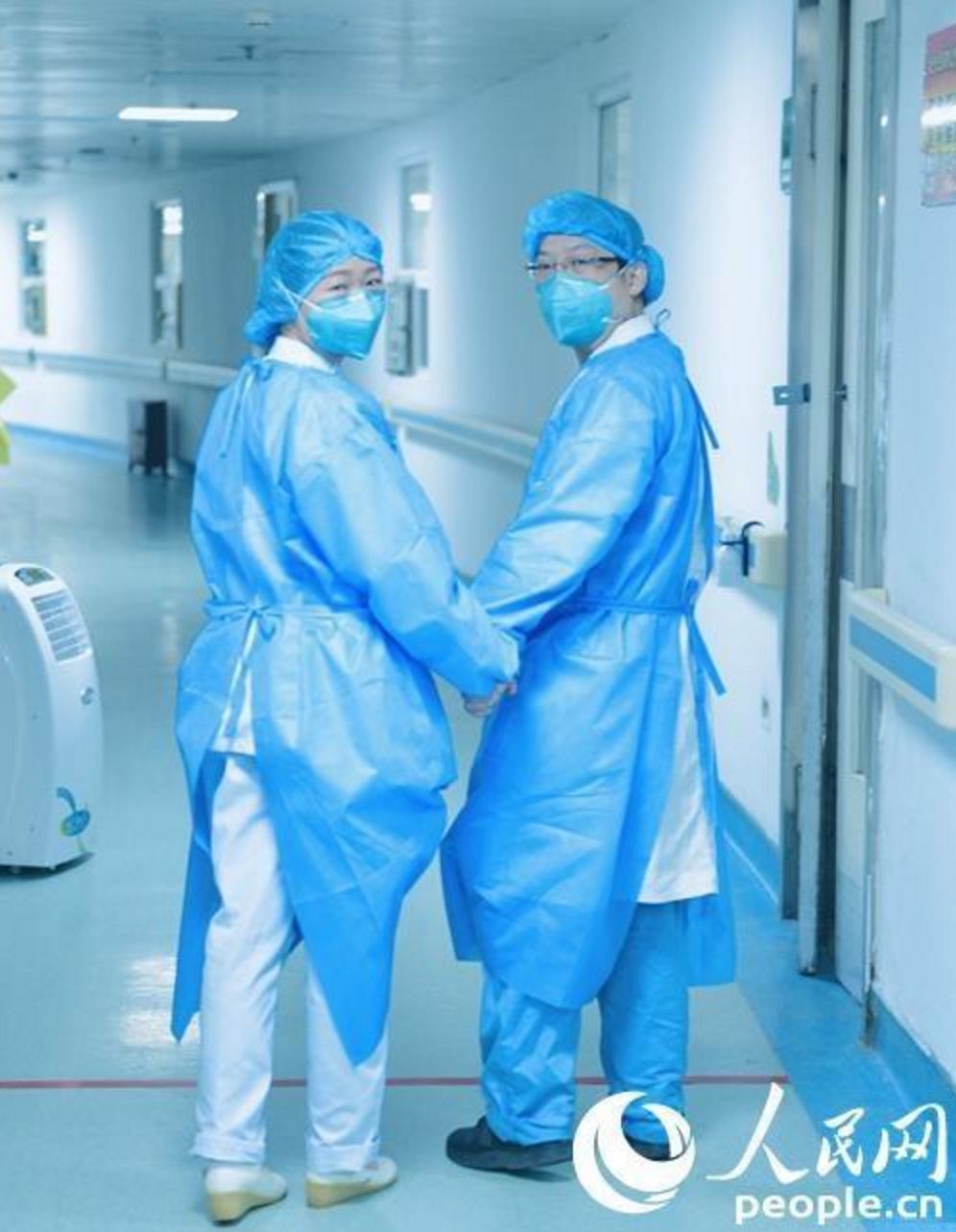 2月4日傍晚,浙江省绍兴市人民医院隔离病房的走廊上,放射科医生陈炳和护士徐小奇这对夫妻相遇了,虽然两个人的防护服都是从头裹到脚,但他们还是通过声音和眼神认出了彼此,两人互相用手指了指,确认是对方后拥抱在了一起。妻子叮嘱丈夫戴好口罩和护目镜,丈夫笑着和妻子说了声加油。夫妻二人随后又各自投入到工作中。
