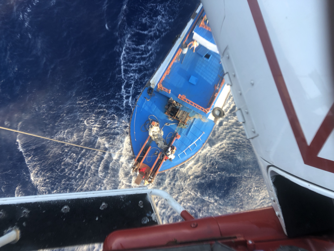 当天下午4时15分,南海第一救助飞行队接到求助信息:在珠海市九洲机场南偏东85海里处海域,“桂北渔99588”的渔船上有1名渔民眼睛受伤、流血不止,请求救助。