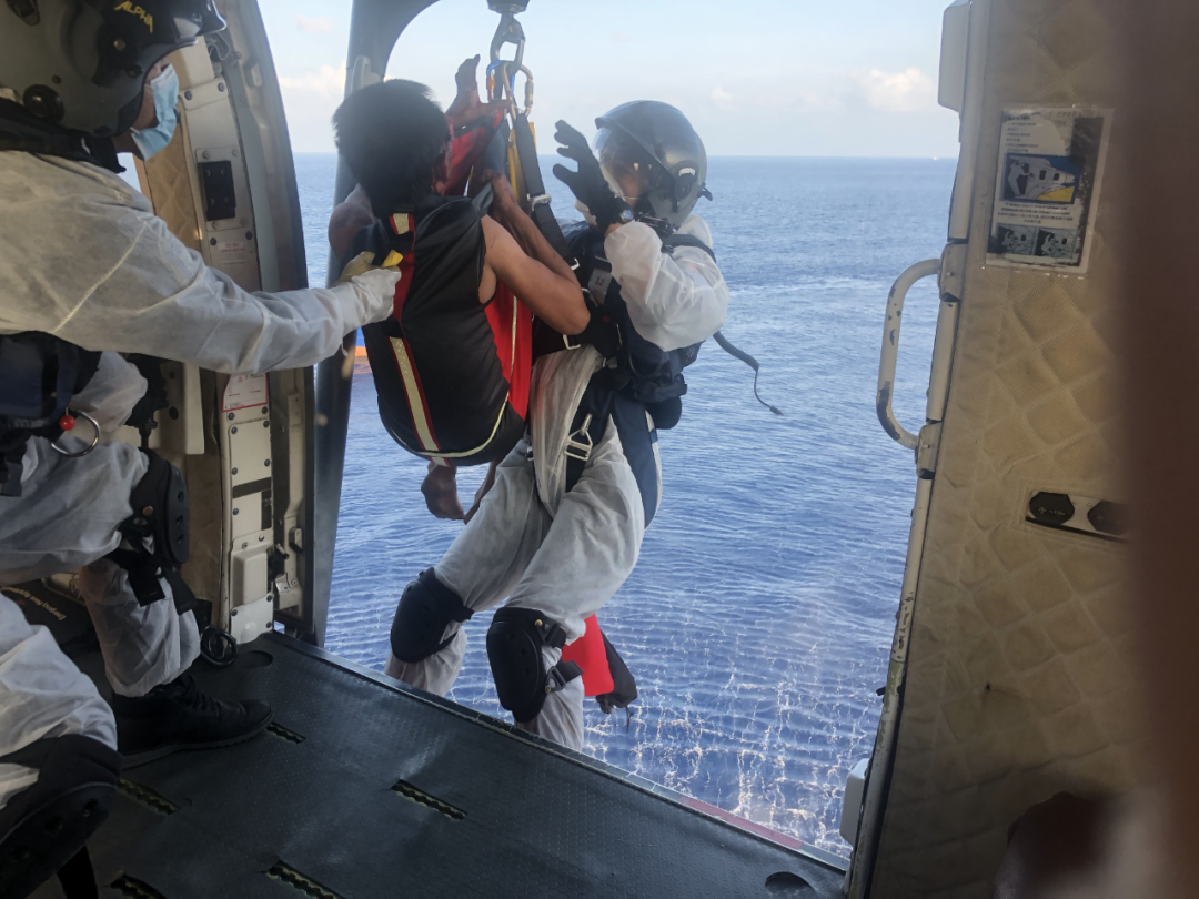 日前,在广东珠江口外海域,“桂北渔99588”渔船上,一名渔民作业时不慎眼部受伤,流血较多,情况危急。被誉为“南海神鹰”的南海救助局南海第一救助飞行队紧急派出B-7136救助直升机,成功将该伤员接回珠海并送医救治。