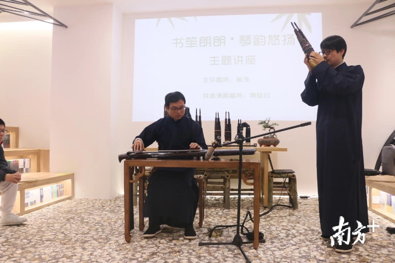 开业当天,横琴书笙馆举办了第一场中华优秀传统文化讲座“书笙朗朗、琴韵悠扬”。数十名澳门中学学生齐聚书笙馆,聆听中国音乐家协会会员崔涛及澳门古琴师黄桂钊的精彩分享与演奏。