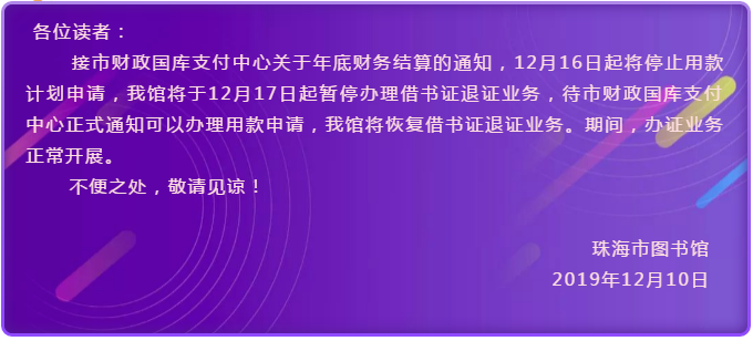珠海市图书馆发布通知,因市财政国库支付中心关于年底财务结算,12月16日起将停止用款计划申请,定于12月17日起暂停办理借书证退证业务,待市财政国库支付中心正式通知可以办理用款申请,市图书馆将恢复借书证退证业务。期间,办证业务正常开展。