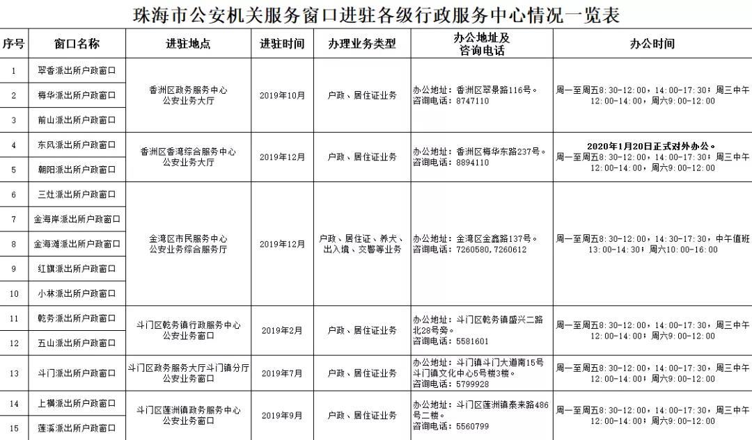 珠海市公安机关服务窗口进驻各级行政服务中心地址电话一览表