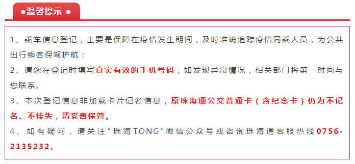 温馨提示:在“珠海TONG”微信公众号回复“卡号”,即可查看公交卡卡号登记指南。