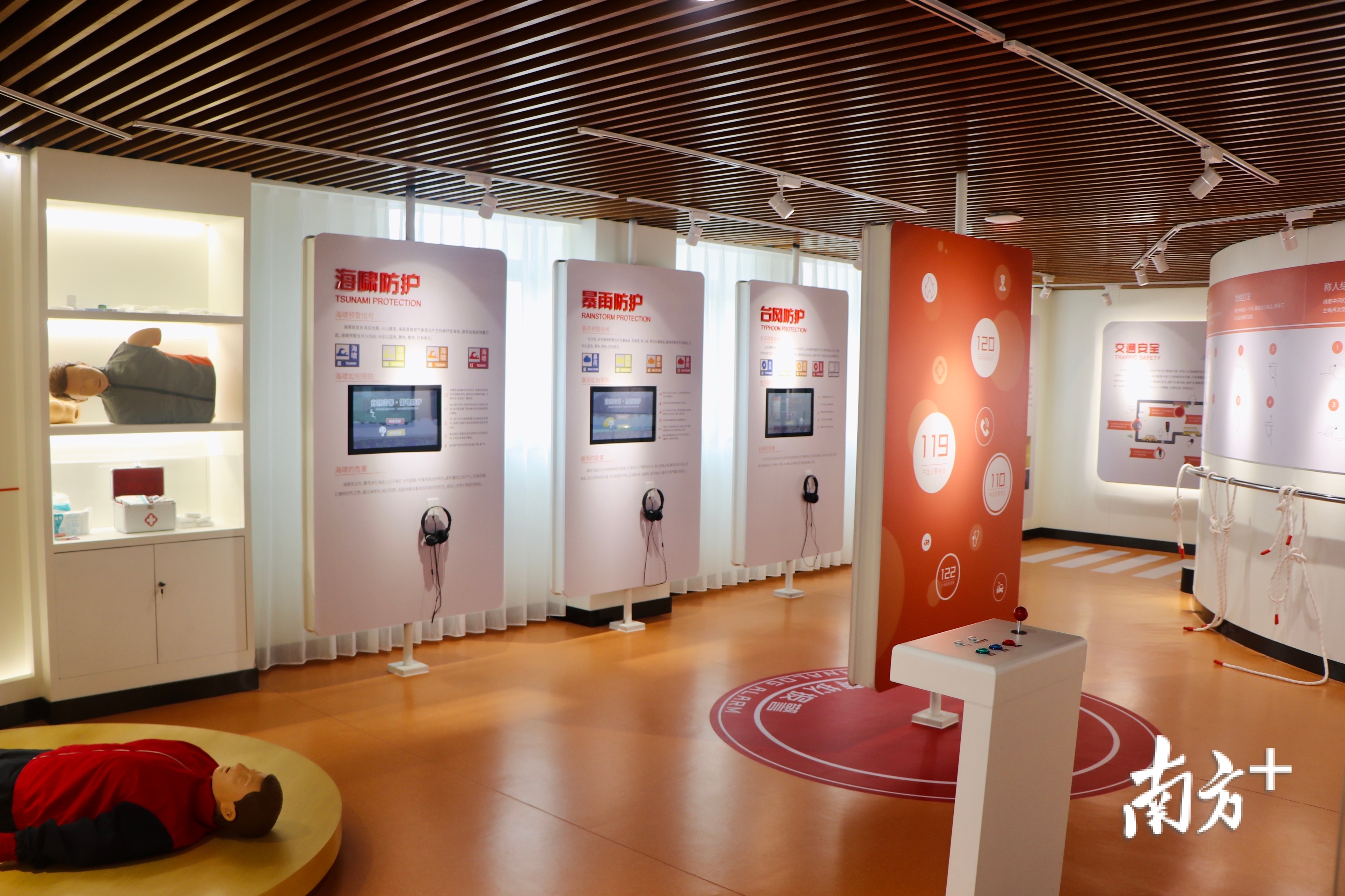 位于同一层的生命安全体验馆,可针对儿童、青少年进行安全知识教育。通过观看视频、问答答题、进行心肺复苏等操作,将课本中的知识转化为体验项目,寓教于乐,激发孩子们的学习兴趣。