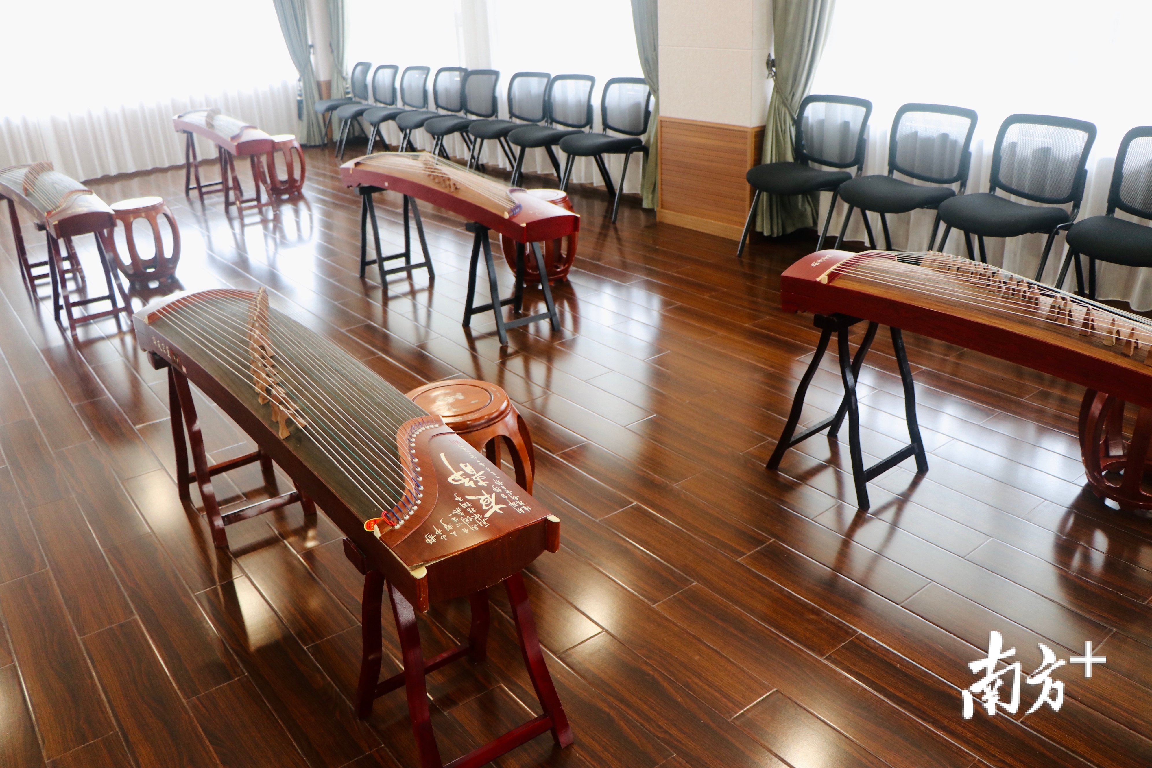 民乐教室里,横放着几台古筝,书画厅四壁则挂满了书画作品,书法教室中备好了笔墨纸砚……