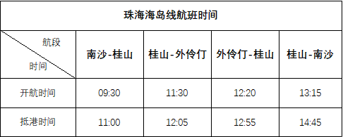 据悉,新航线全程约58海里,航行时间约125分钟,沿途将穿行港珠澳大桥,巡航珠江口。航线设置为由广州南沙客运港出发,中途停靠桂山岛,最后抵达外伶仃岛,其中南沙客运港至桂山岛约90分钟,桂山岛至外伶仃岛约35分钟。目前新航线只在每周五、六、日及节假日营运,后期航班将视乎客量逐步增开。