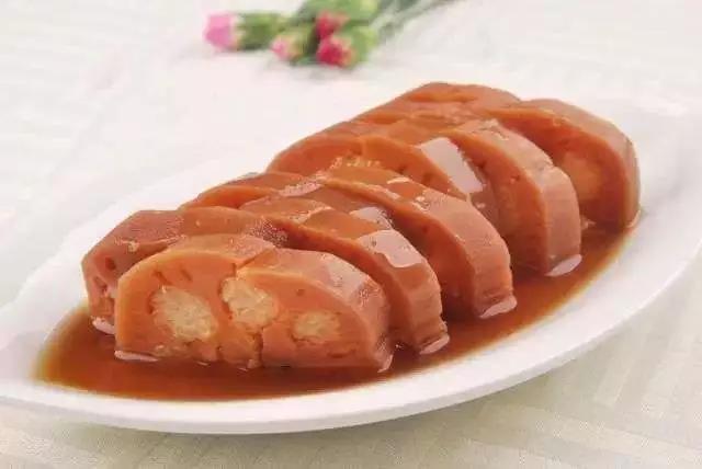 一盘糯米糖藕,四周摆了一圈切得极薄的五花肉。将那藕片用五花肉包起来,放进嘴里,慢慢嚼。竟不觉甜腻,异的是,有一股茶香氤氲于齿颊,久而不去。这“云雾藕”,是将带皮肉放在铁箅子上,用明前的龙井熏上两个小时。