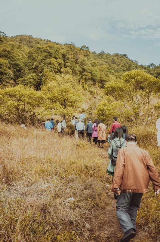 韩山层峦叠嶂,青山如黛,云雾缭绕,泉水潺潺。丰顺八景之一的“韩岽笼云”就在此地。在比赛之前,与会诗人漫步韩山采风,在历史遗迹中与古人隔空对话。在景区的东南部,南山寺斋公田庙遗址只剩下断壁残垣。据当地县志记载,南山寺始建于宋代,溃于清朝乾隆年间,此地曾是南山寺庙产田地。遗址附近有一处古驿道,是古代通往潮州的主干道,几块颜色发黑的石板,见证了过往的繁华。