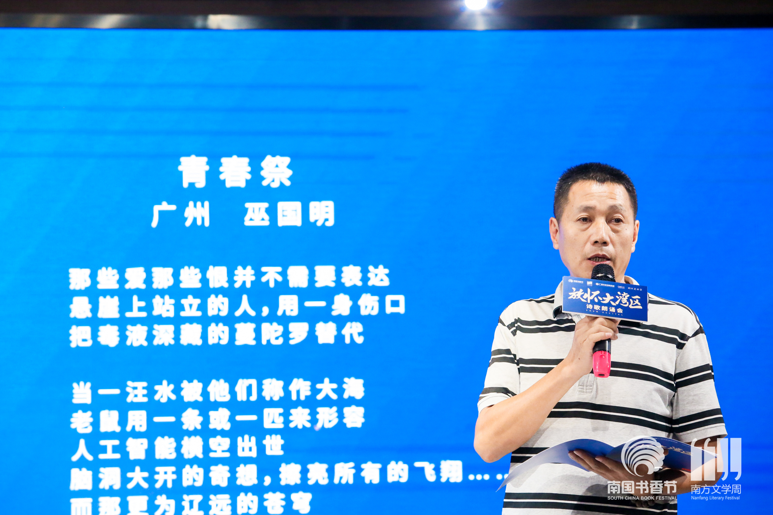 作为今年南方文学周最受瞩目的活动之一,广州诗人黄礼孩、世宾、巫国明、郑小琼、肇庆诗人白炳安、深圳诗人刘美松、唐成茂、东莞诗人方舟、惠州诗人江湖海、中山诗人倮倮、江门诗人李白云等大湾区各座城市的诗人代表应邀到场。本次朗诵会特别邀请了十月文学院常务副院长、北京诗人吕约,开启北京和大湾区的诗歌交流和对话。