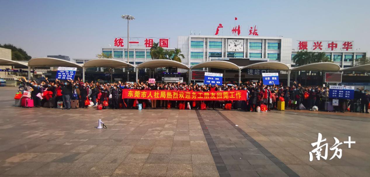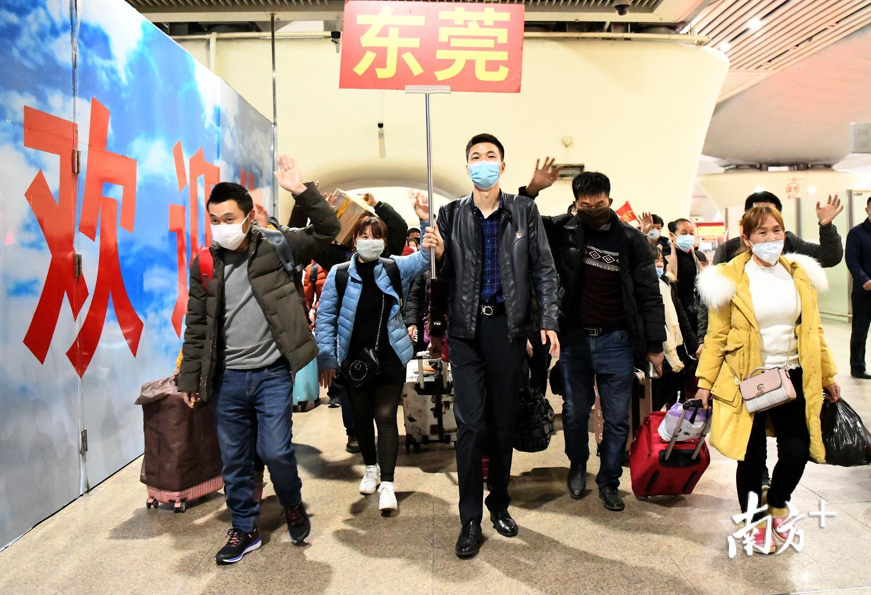 2月19日,有两趟专列来粤,从广西百色到广州的专列D4508,免费运送756名百色籍务工人员,赴东莞的有220人;从昆明到广州的专列D4856,车上468名员工中,前往东莞工作的就有194人。