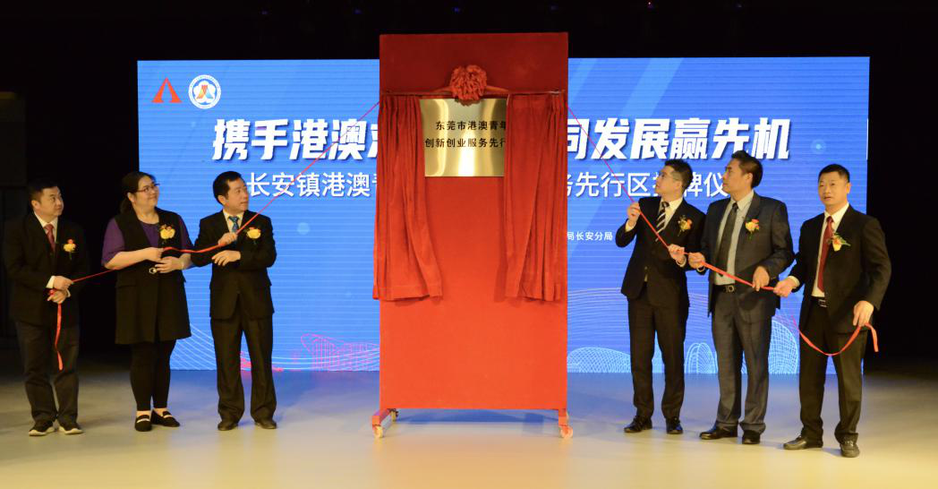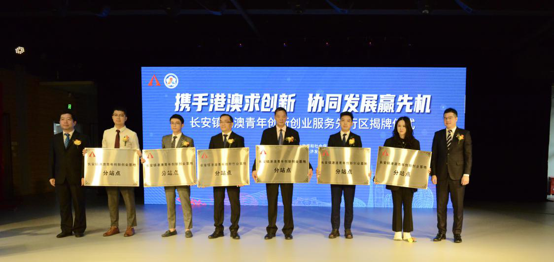 仪式上,侯首文、戴浩平、市人力资源服务中心人才服务科科长李珲、长安人社、医保分局局长麦永光、长安镇经济发展局局长蔡灿明及长安人社、医保分局副局长王劲榕共同为“长安镇港澳青年创新创业服务先行区”揭牌。