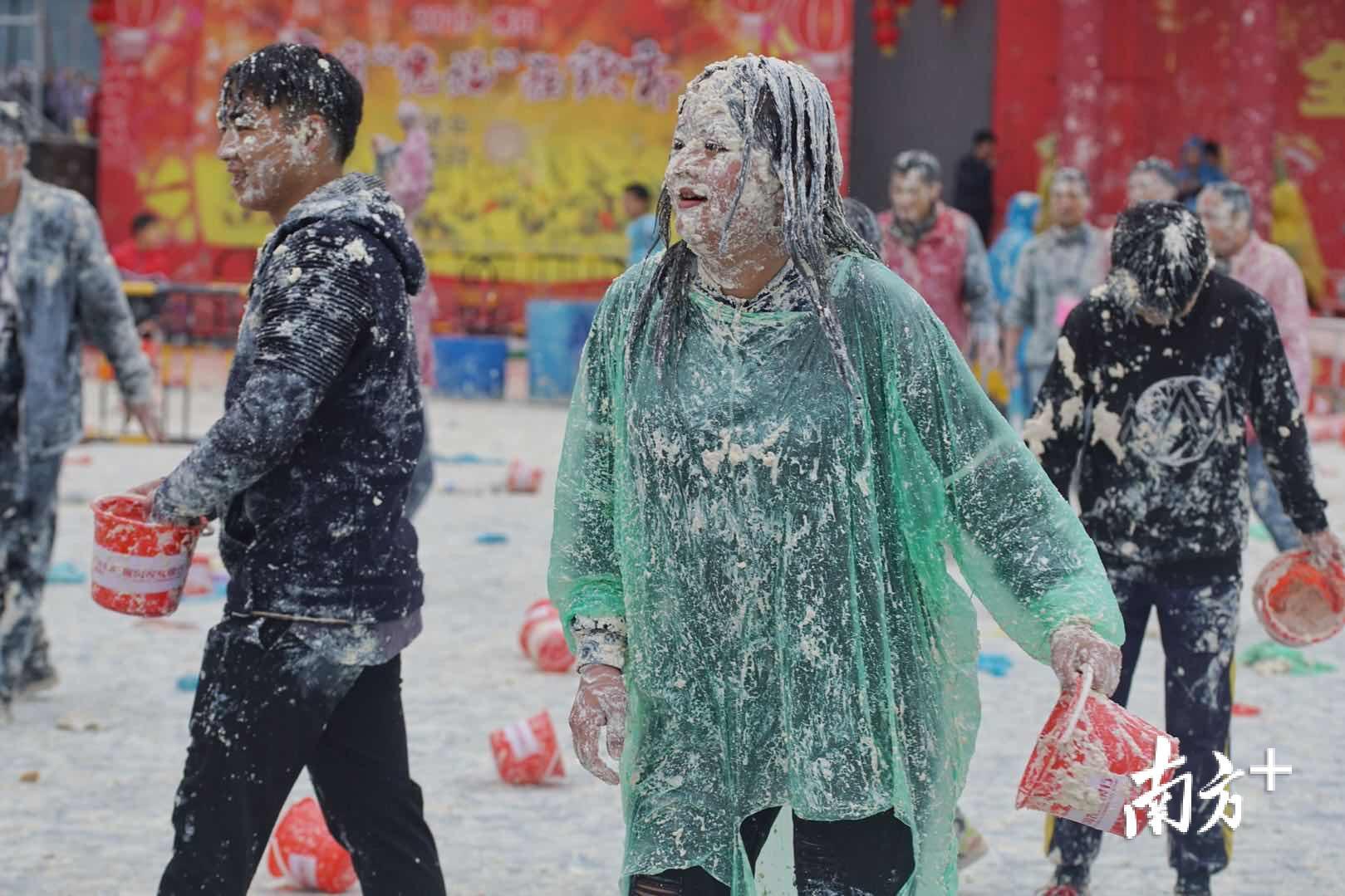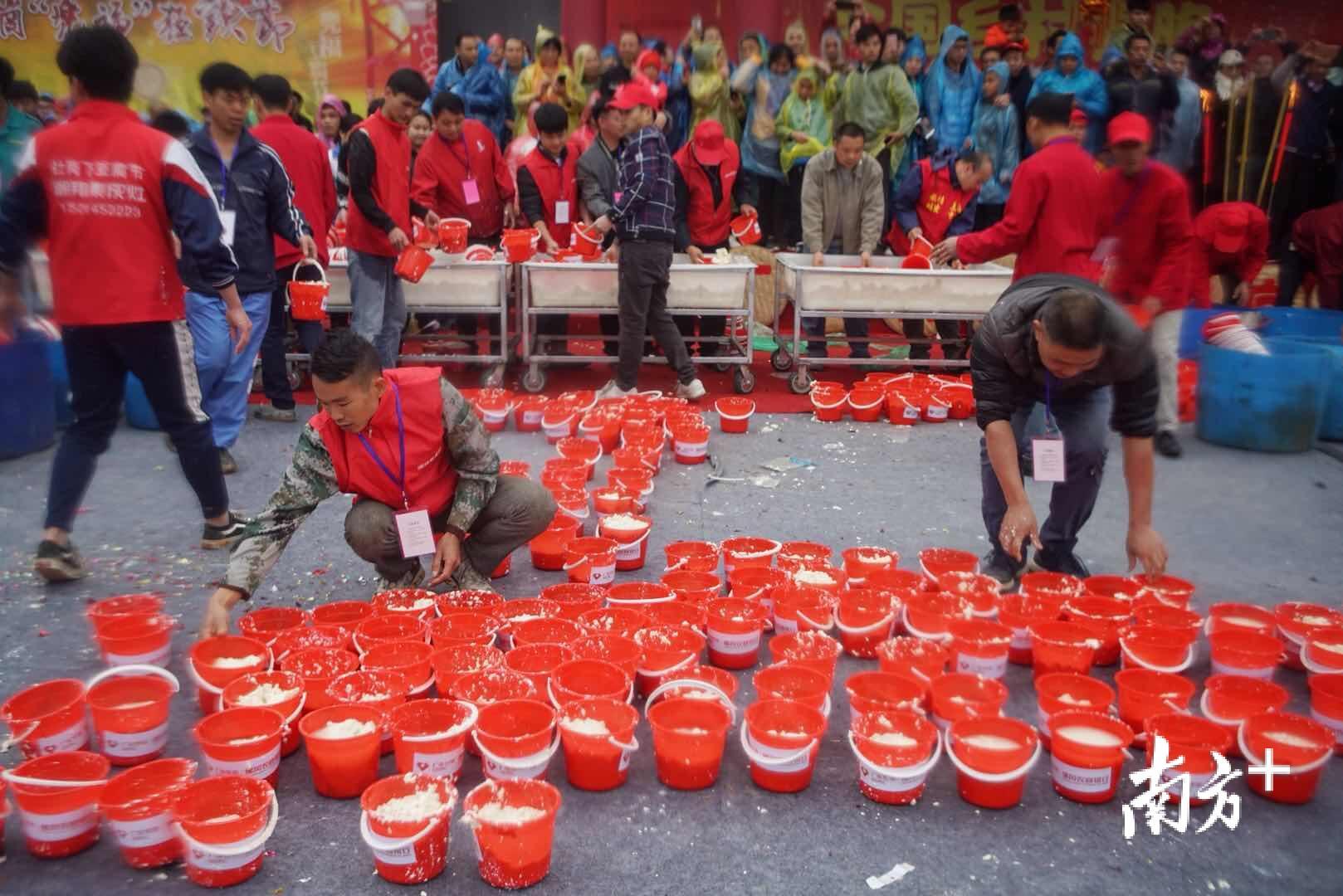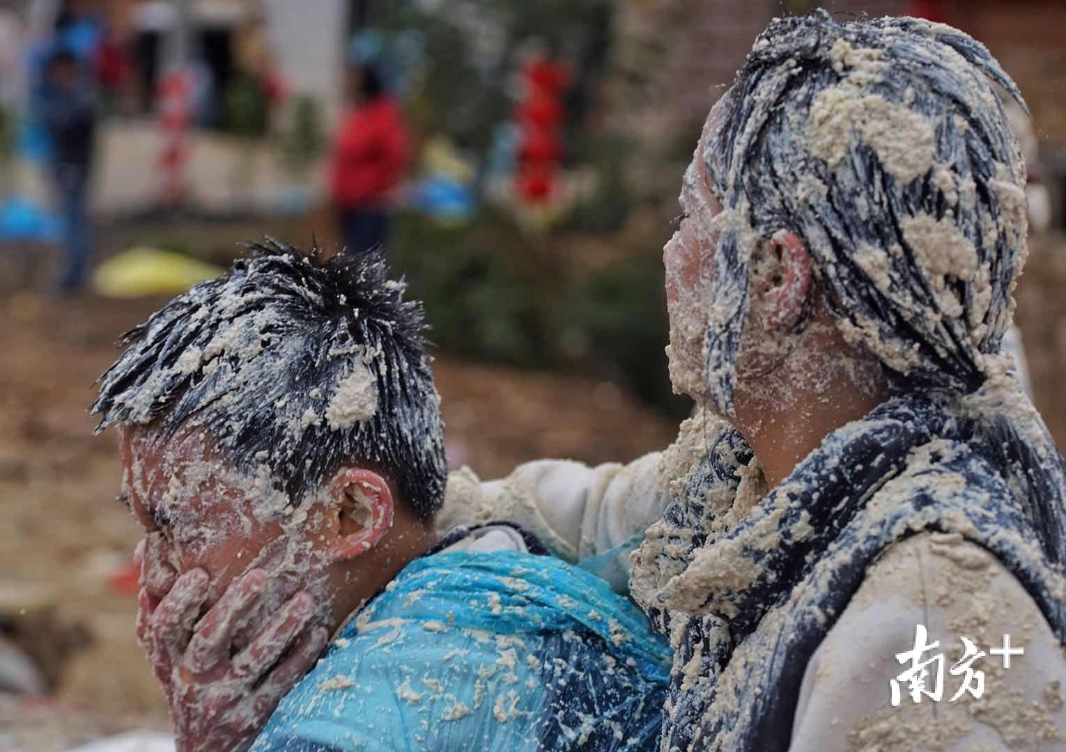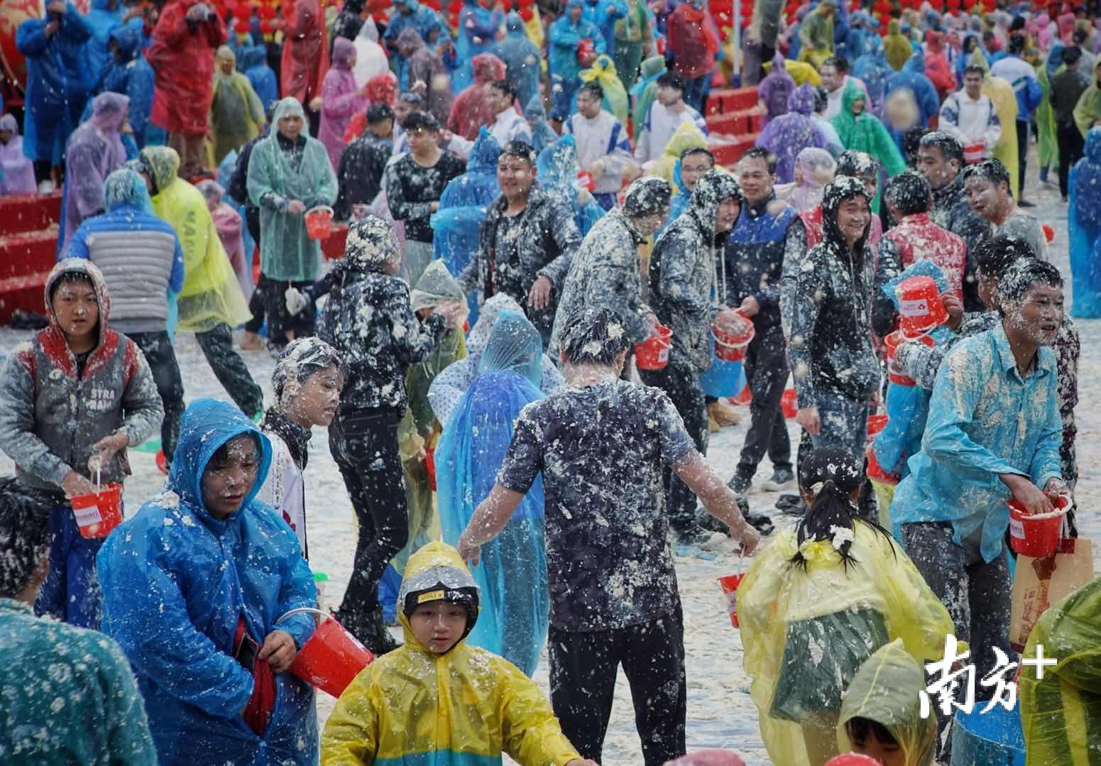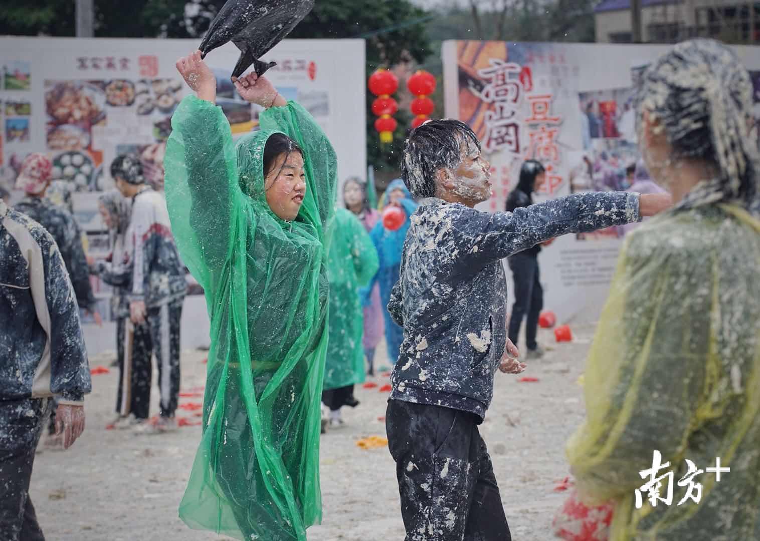 2月17日,万人相聚清远市佛冈县高岗镇社岗下村,以互掷豆腐的方式“兜福”狂欢。