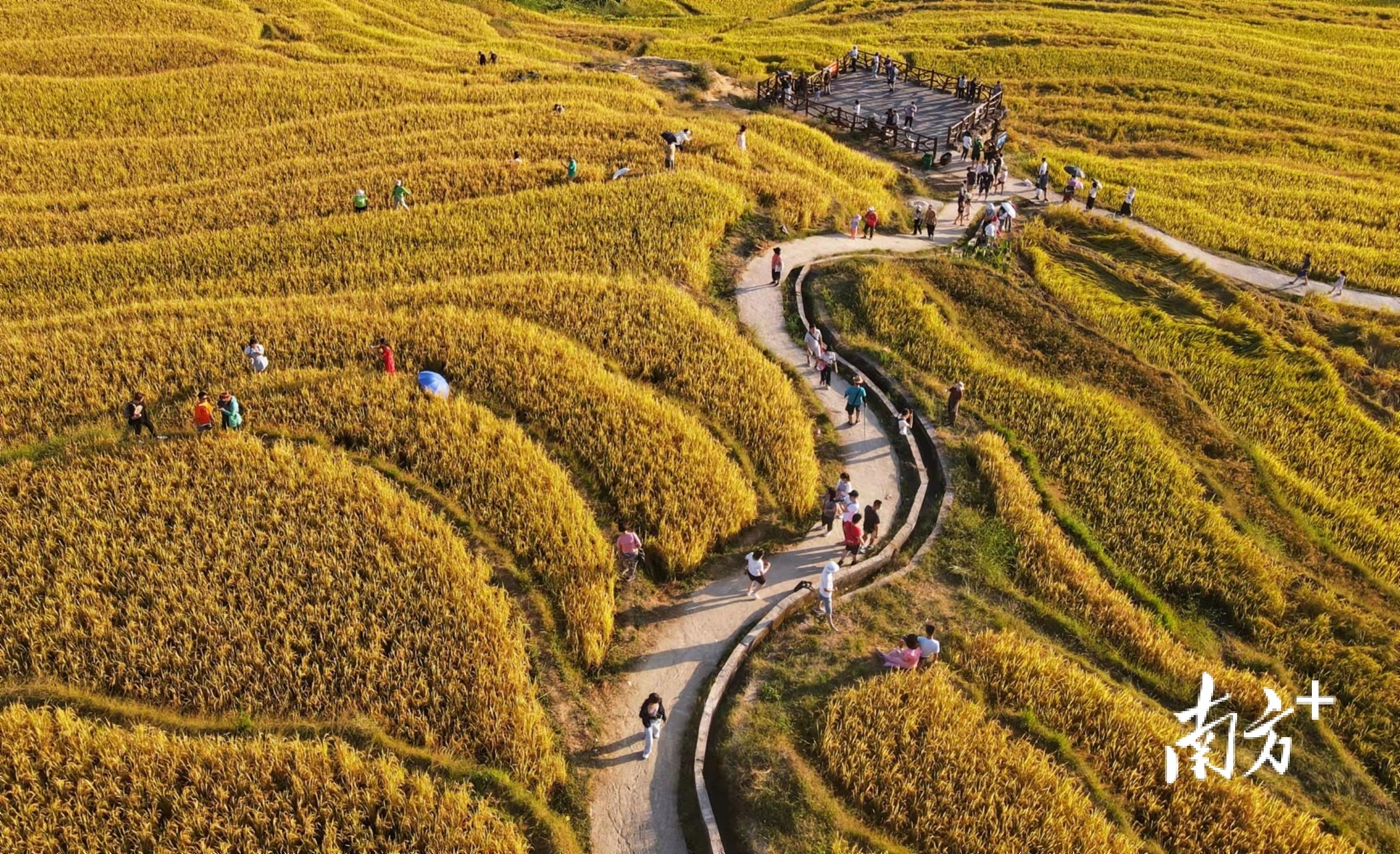 10月4日,国庆长假过半,此时,清远连山壮族瑶族自治县太保镇的欧家梯田和黑山梯田已是金黄一片,成熟的稻谷沿着山坡连绵起伏,从空中俯瞰,宛如一块天然的调色板,美如画卷。正值一年中最美的观赏时刻,梯田吸引了不少珠三角游客慕名前来打卡。
