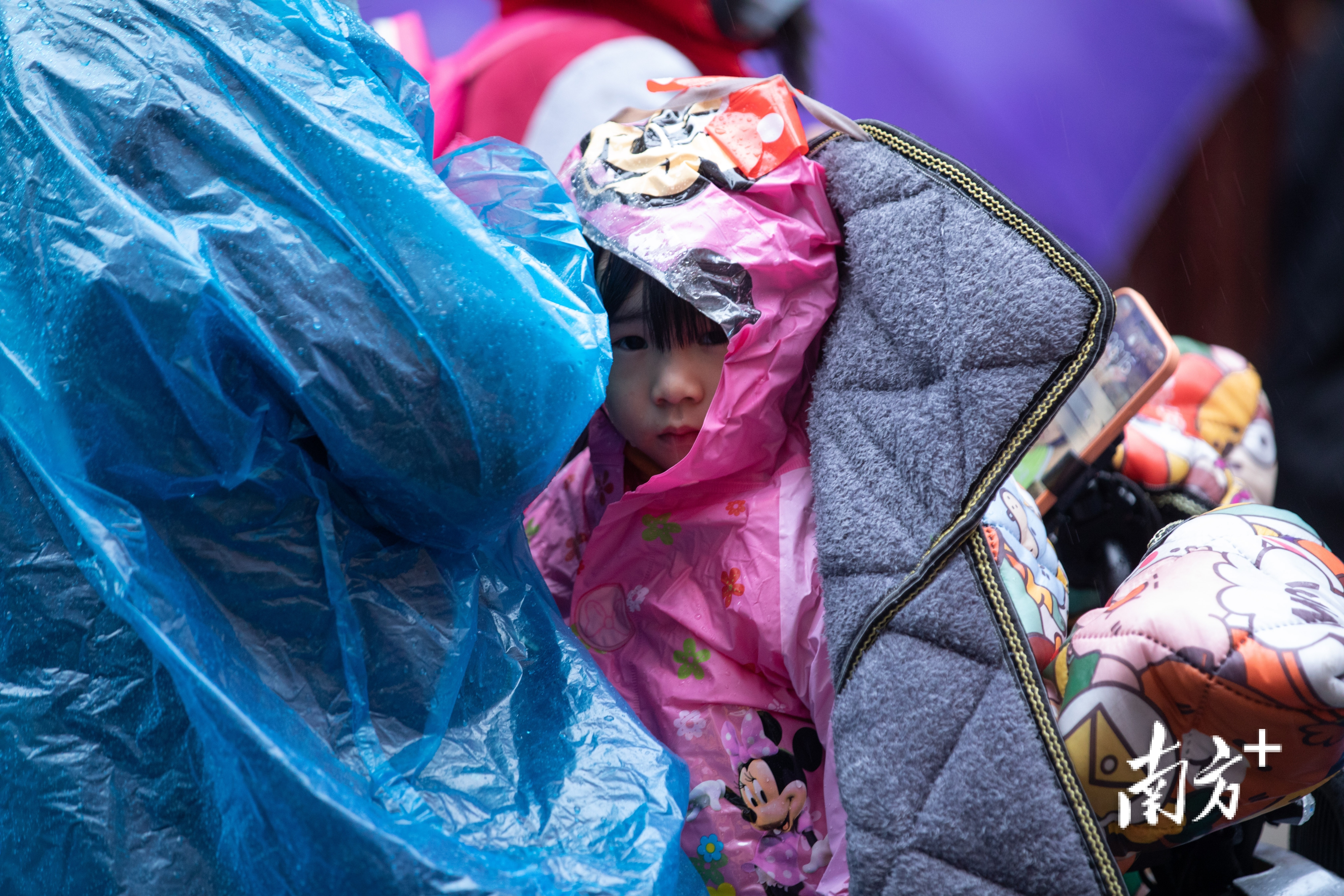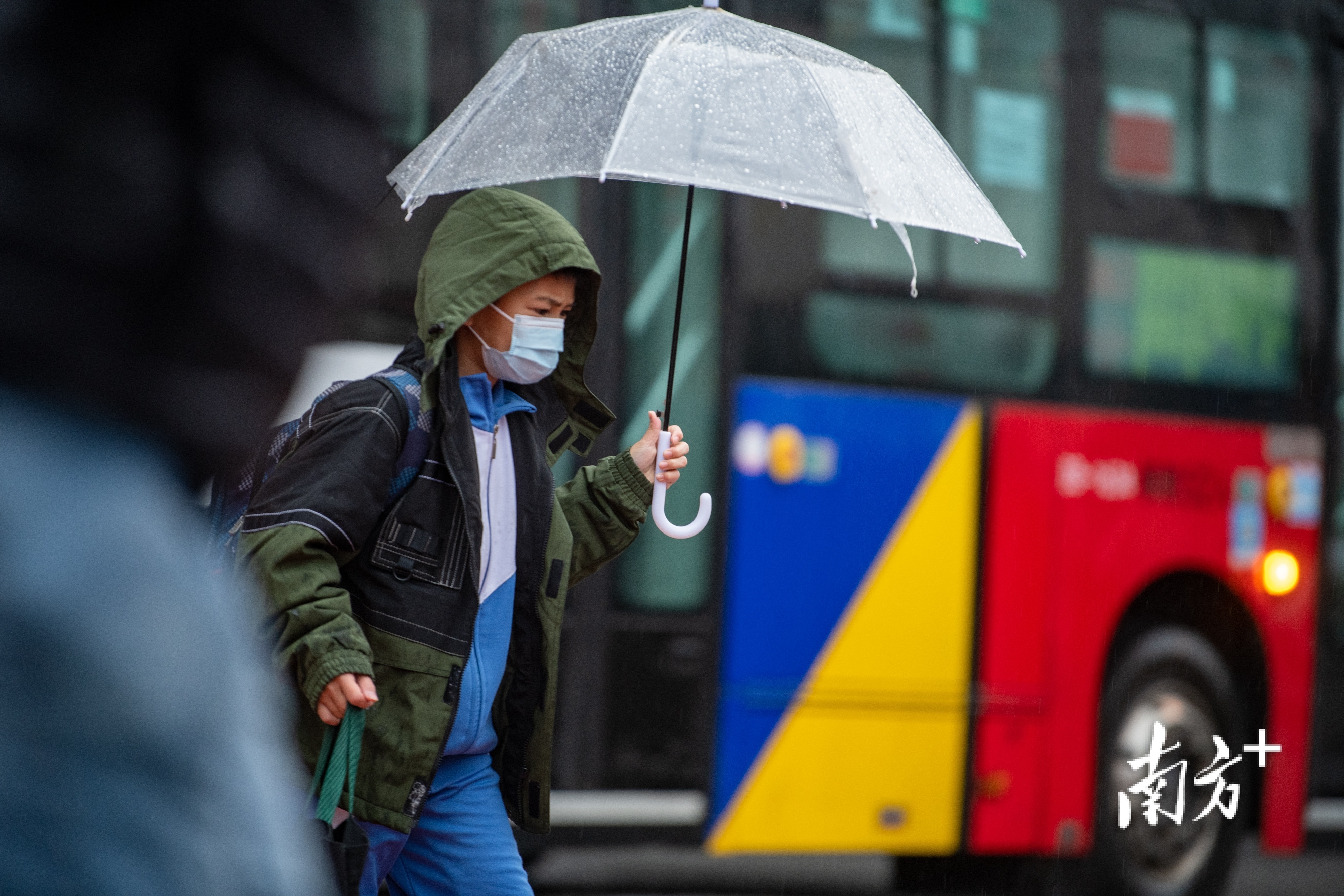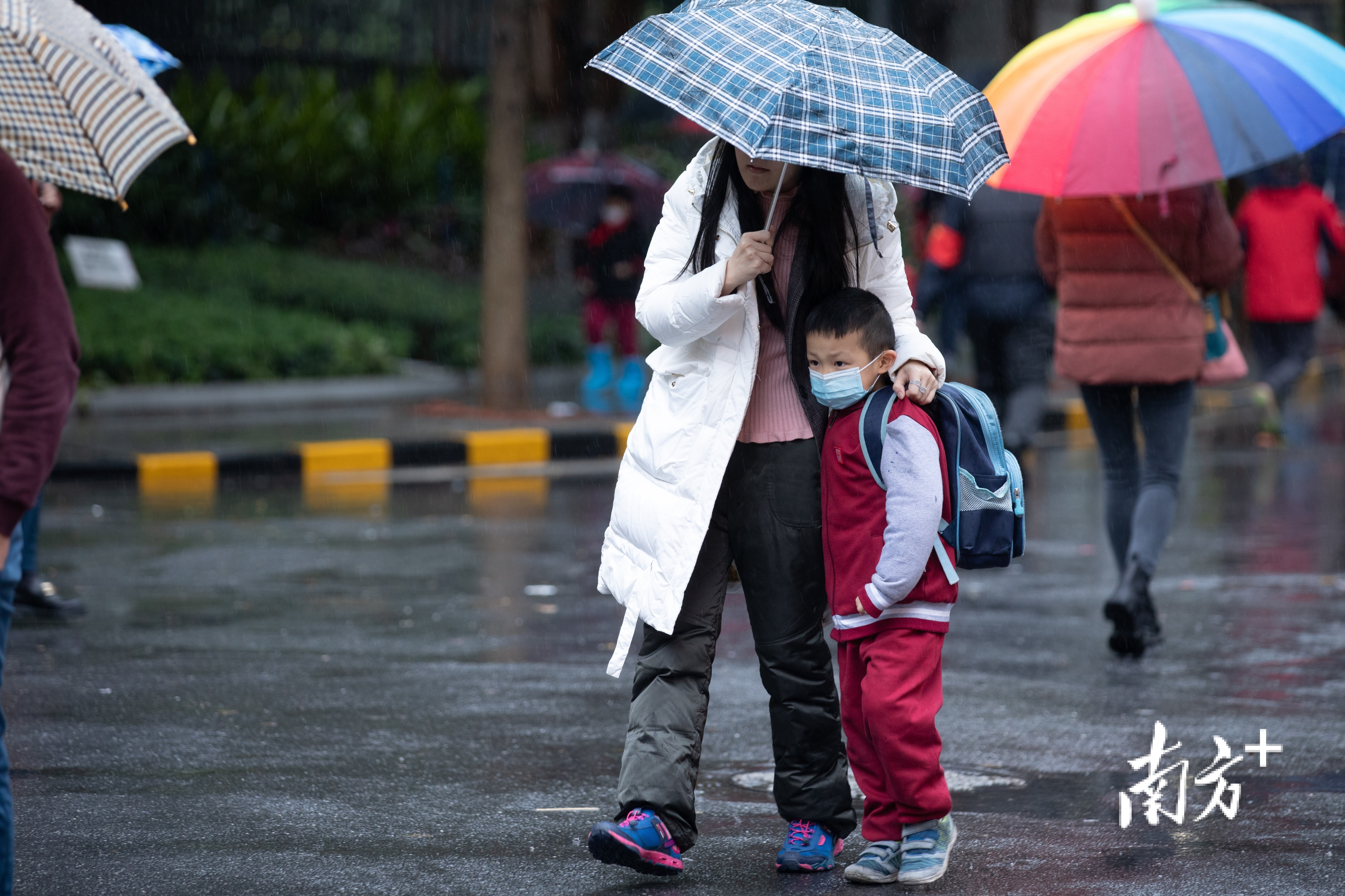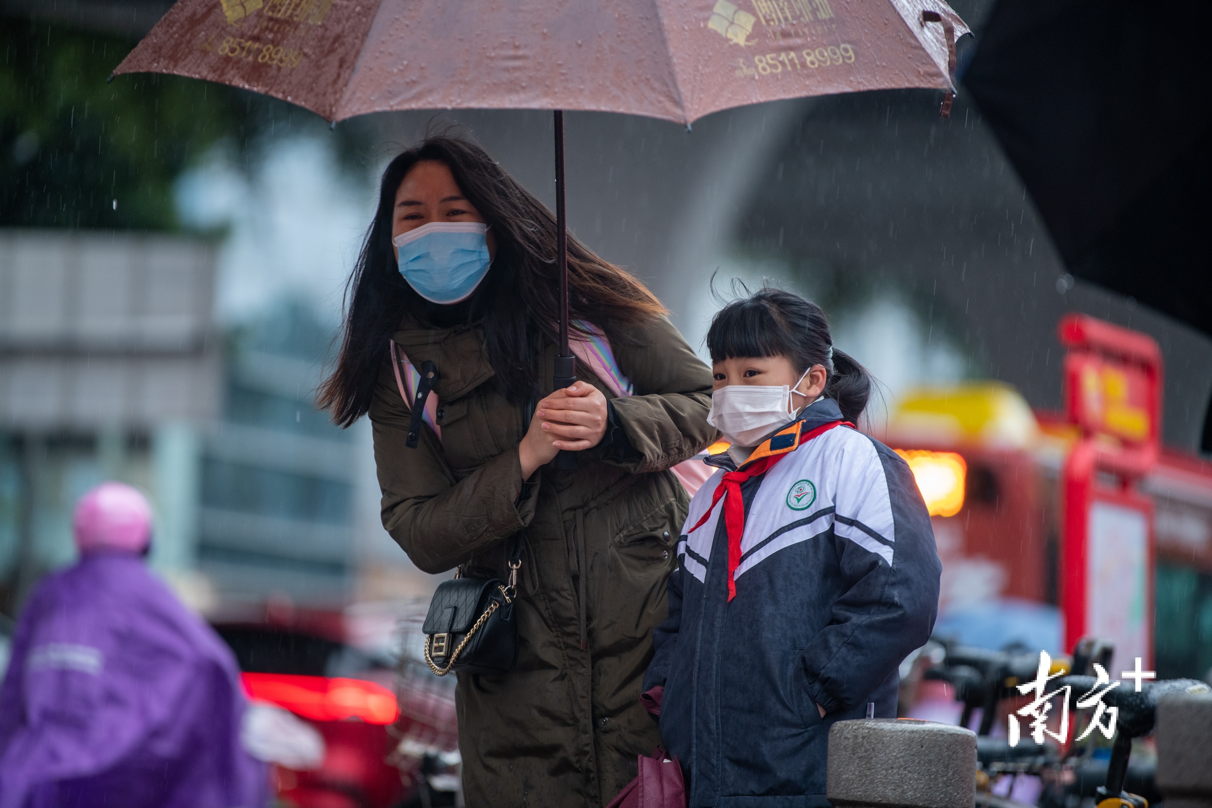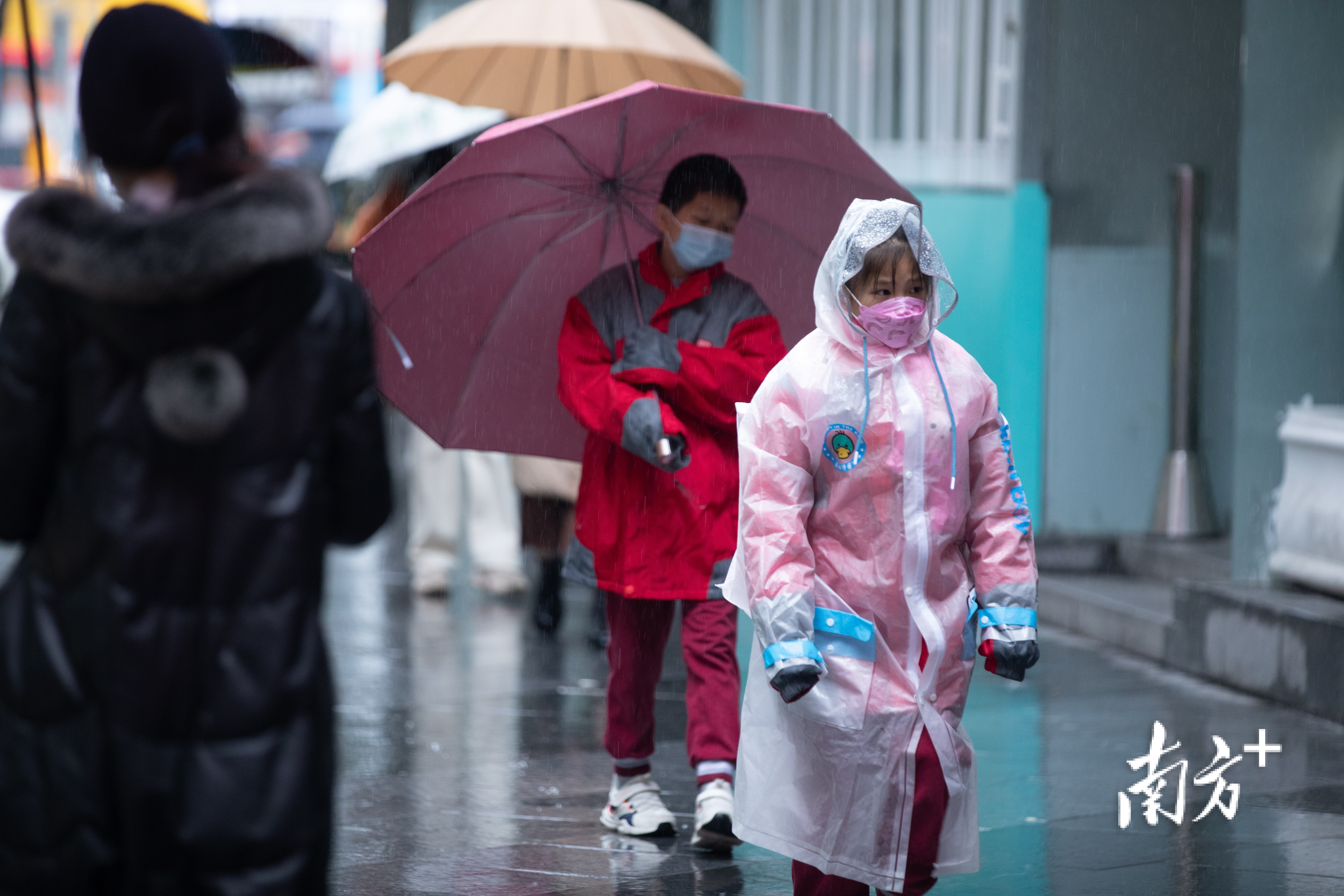 2月21日,广州市区小雨绵绵,最低气温低至4℃。东晓南路上,市民们纷纷穿上厚棉袄御寒,许多家长也给孩子戴上围巾手套以免受寒。