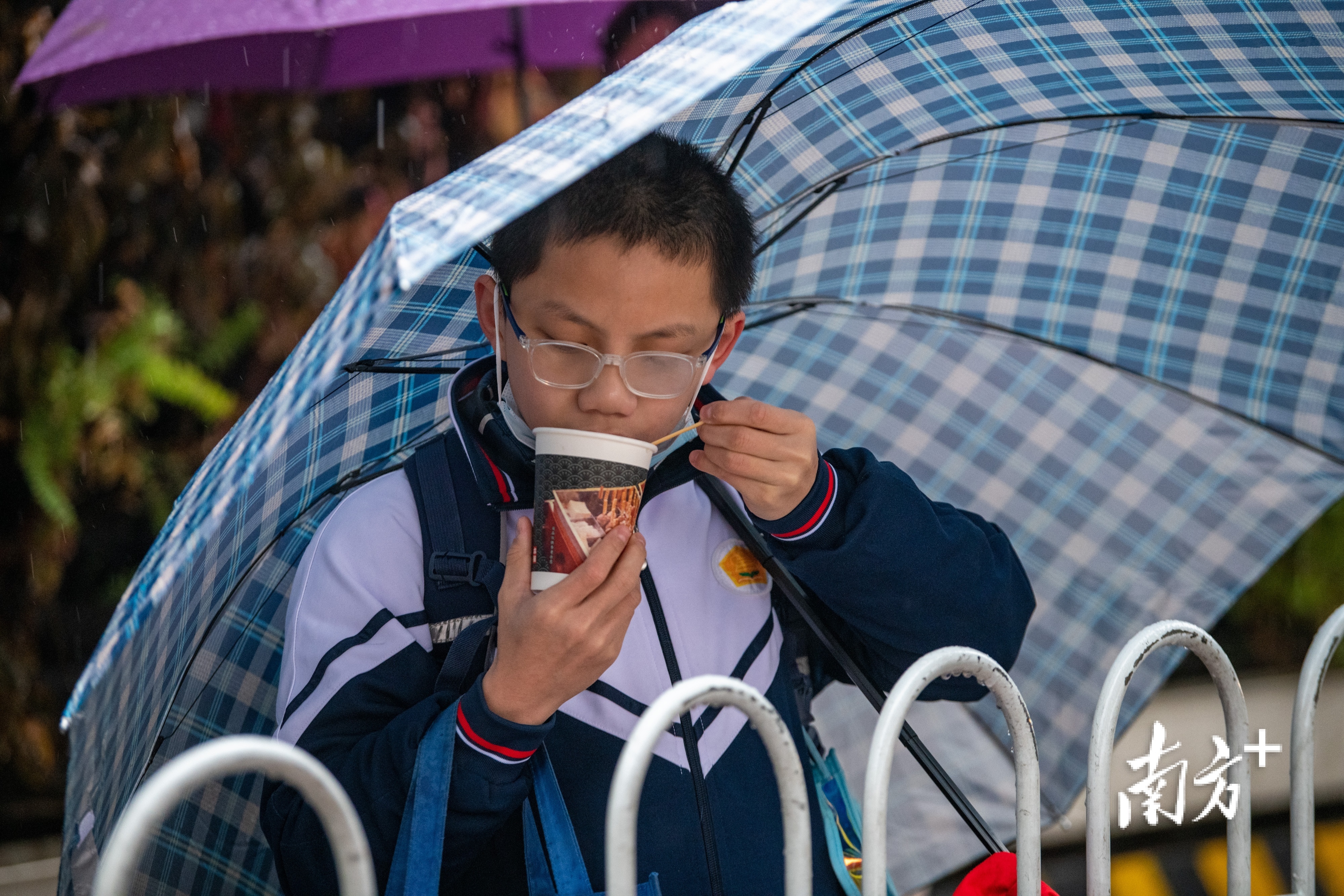 2月21日8时左右,冷空气抵穗后迎来周一,越秀区杨箕小学的家长纷纷裹上棉服、雨衣,冒着寒雨送孩子上学,学校通过播放喇叭提醒家长和学生路面湿滑,注意出行安全。