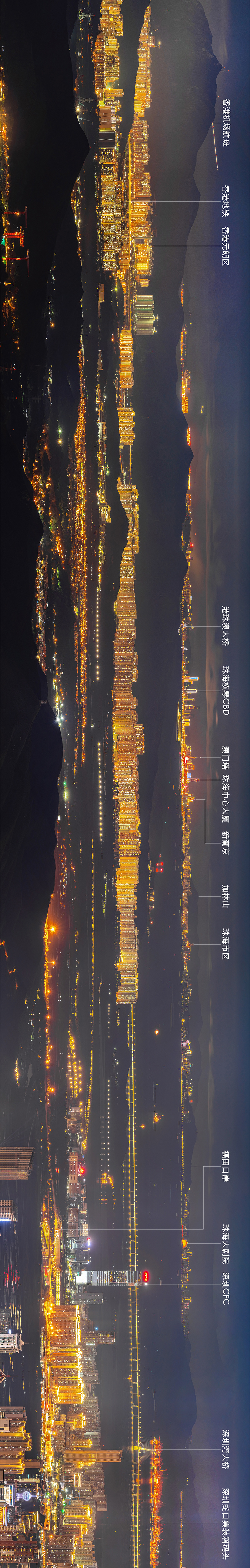 图片上,除了夜幕下五彩斑斓的城市地标,还能看到港珠澳大桥、深中通道、深圳湾大桥等重大工程,近年来,粤港澳三地深化多领域协同发展,基础设施正加速互联互通,各类生产要素在湾区城市间快速便捷流通。