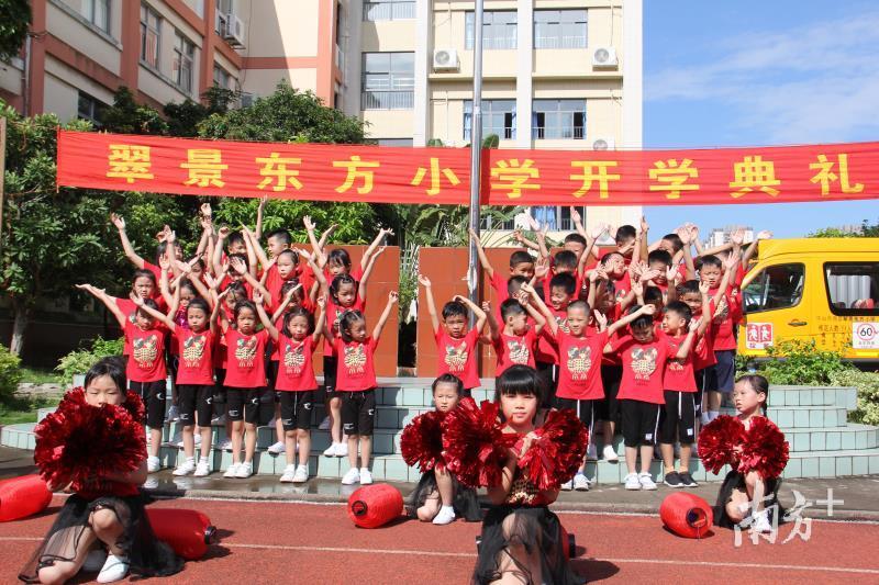 上午8时,黄圃镇新地中心小学举行了新学年开学典礼暨开学第一课。198名一年级新生在高年级学生的带领下,走上红地毯,穿过“梦想之门”,进入小学的学习生涯。随后,1000多名学生在新校园中凝听了校长的开学第一课,开启新学年。新地中心小学是黄圃镇当地一所知名学校,学校创办于1940年,至今已有70多年历史。随着地区发展,该校办学规模已不能满足社会需求。