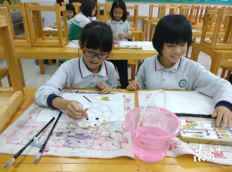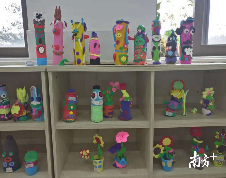 12月5日下午,在中山铁城小学的美术教室里,40张图画拼接在一起,组成了一个“机器人”。据学校艺术科组长罗嘉雯介绍,这个图画名为“轻粘土仿铜画”,学生用超轻粘土捏成各种各样的形状,贴到正方形的纸板上,然后用仿铜色的颜料上色,最终风干成为成品。