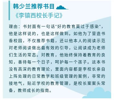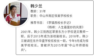 “读书、交流、分享,就像喝一杯茶如此简单。”在今年4月23日的世界读书日,韩少兰给教师们做读书分享时表达了这一观点。以往做语文教师时,韩少兰个人偏好文学类作品,成为校长后,她更注重阅读学校管理方面的书籍,希望能做一个优秀的校长。去年她刚读完《李镇西校长手记》一书,颇有感触。李镇西强调,好的教育莫过于感染,校长怎么做,老师就会怎么做,韩少兰深以为然。