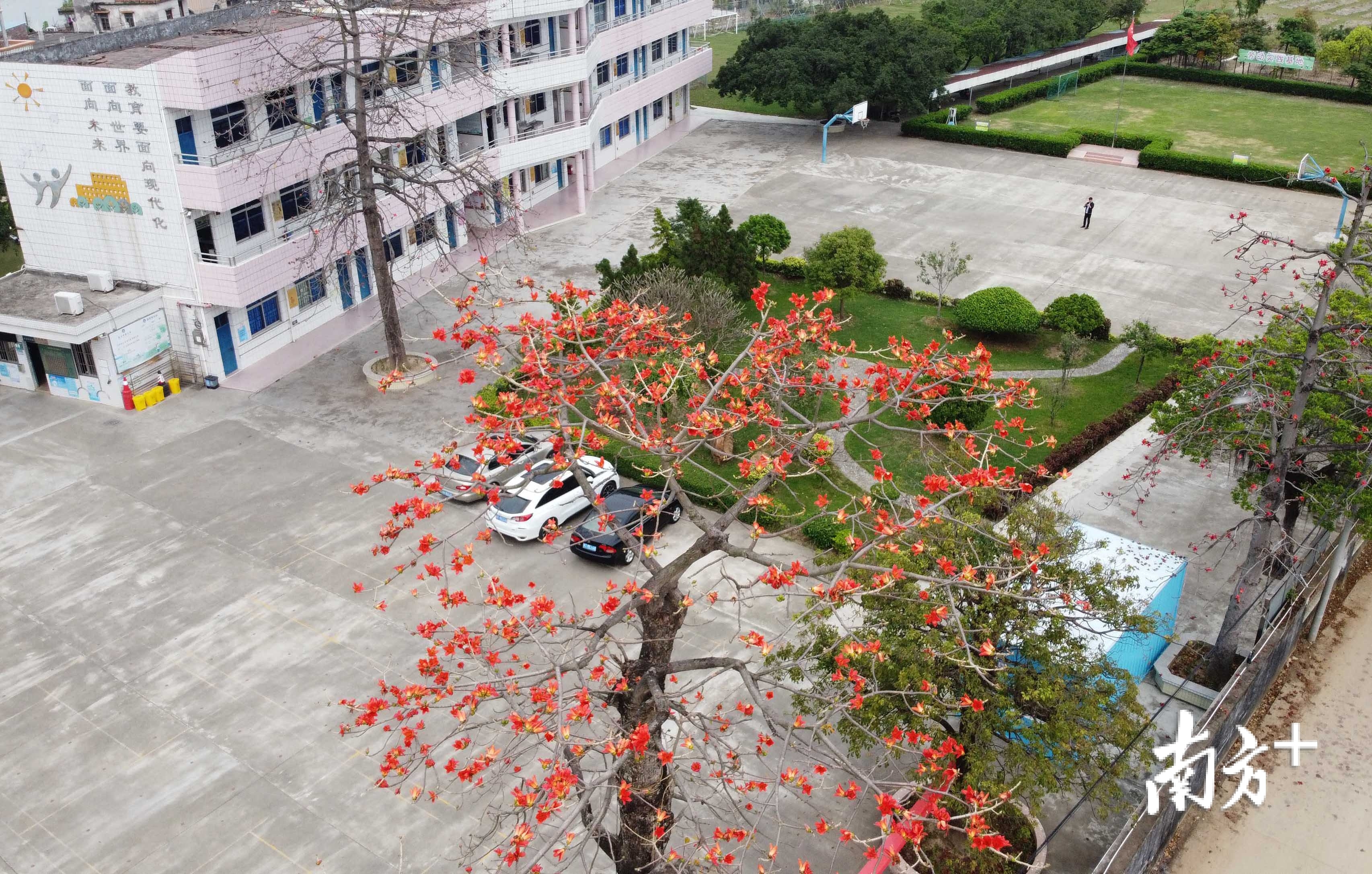 前有鱼塘,后有河涌,站在阜沙丰联小学的操场上,迎面吹来阵阵凉风,耳边是呱呱的蛙鸣。绿油油的劳动实践基地里,栽满了木瓜、南瓜、火龙果等果蔬。航拍下的校园,火红的木棉花开得正热烈,好一幅惬意的乡村小学风景图。