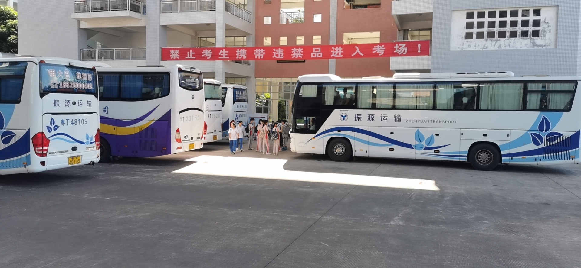 上午8点02分,大巴准时到达中山市濠头中学考点,考生们陆续进入考场。不少考生在考点的宣传栏前简单驻留,对着上面挂着的标准钟调整自己的手表。