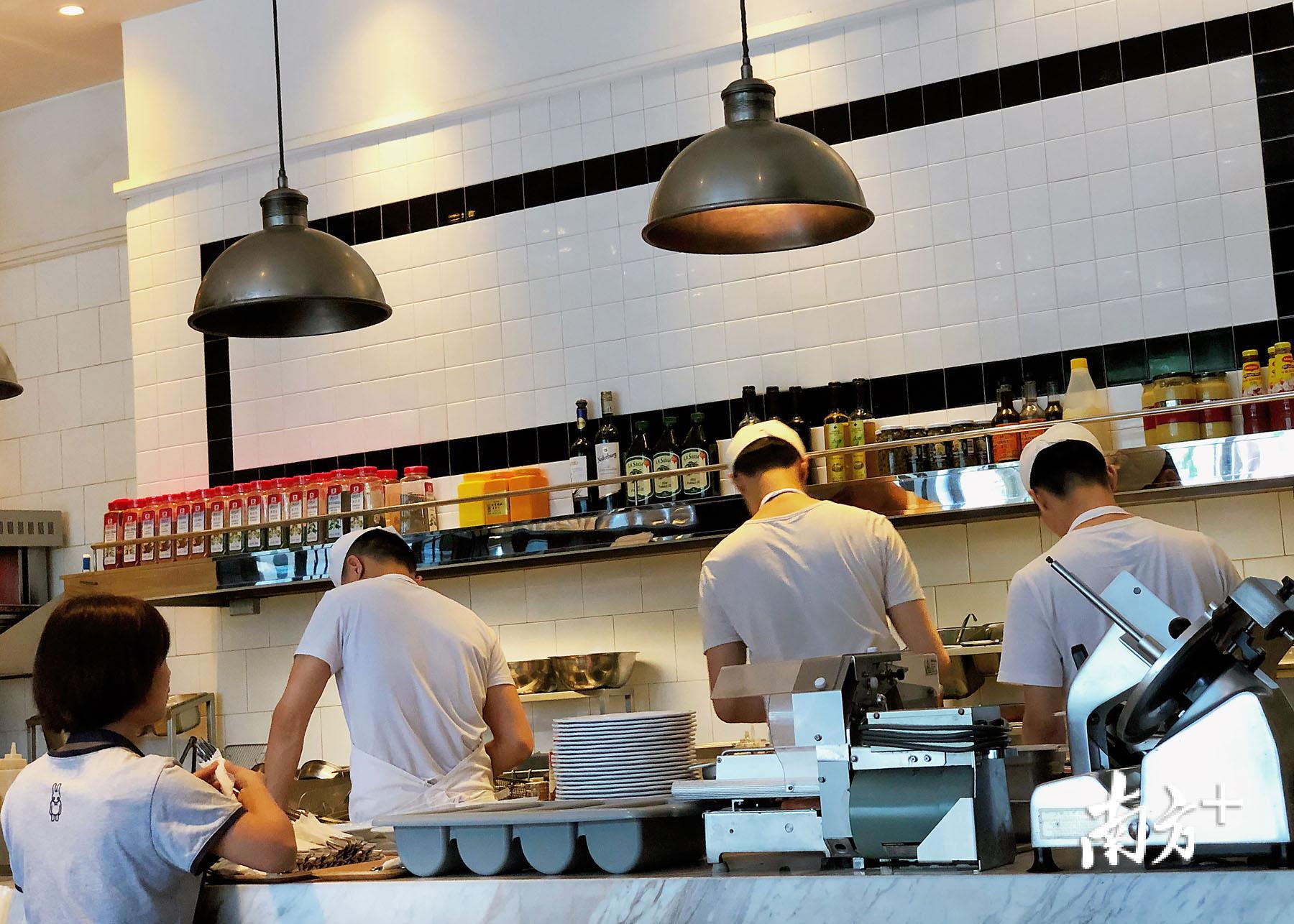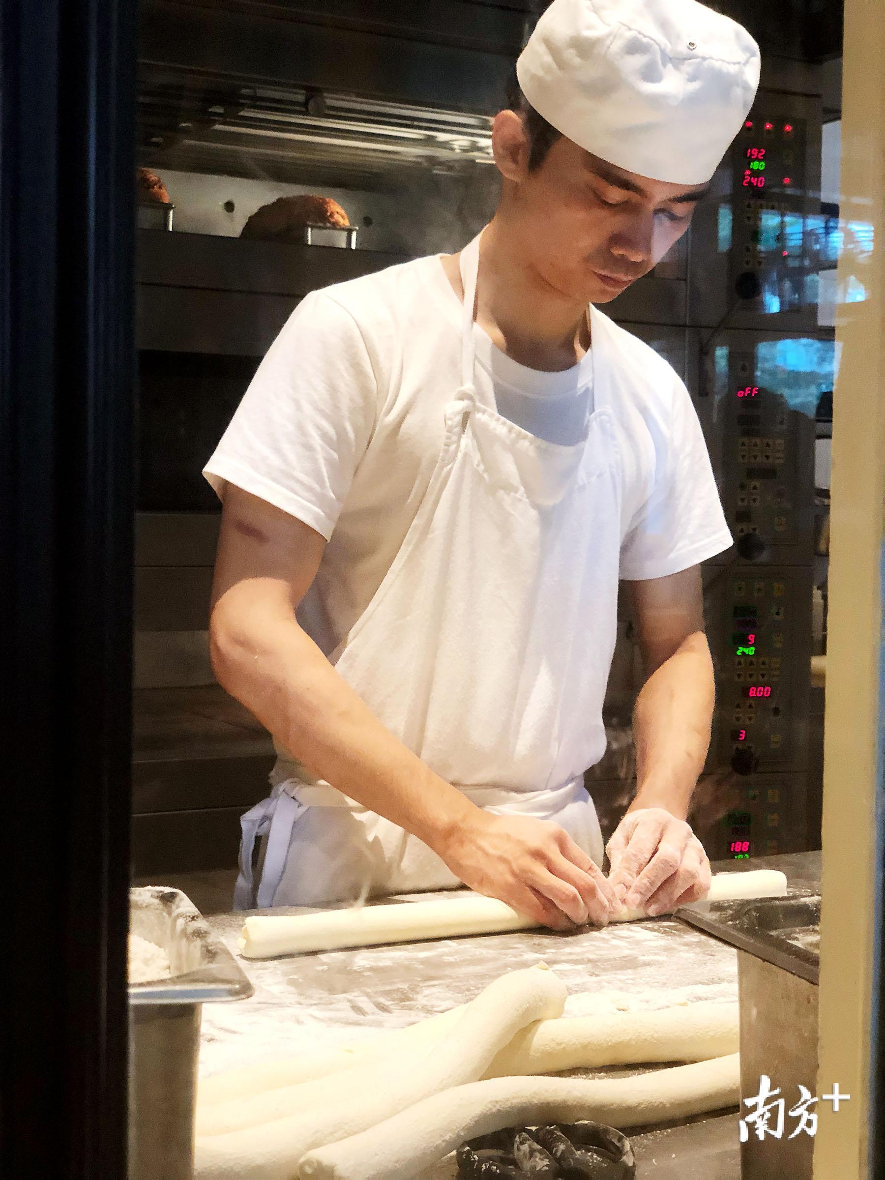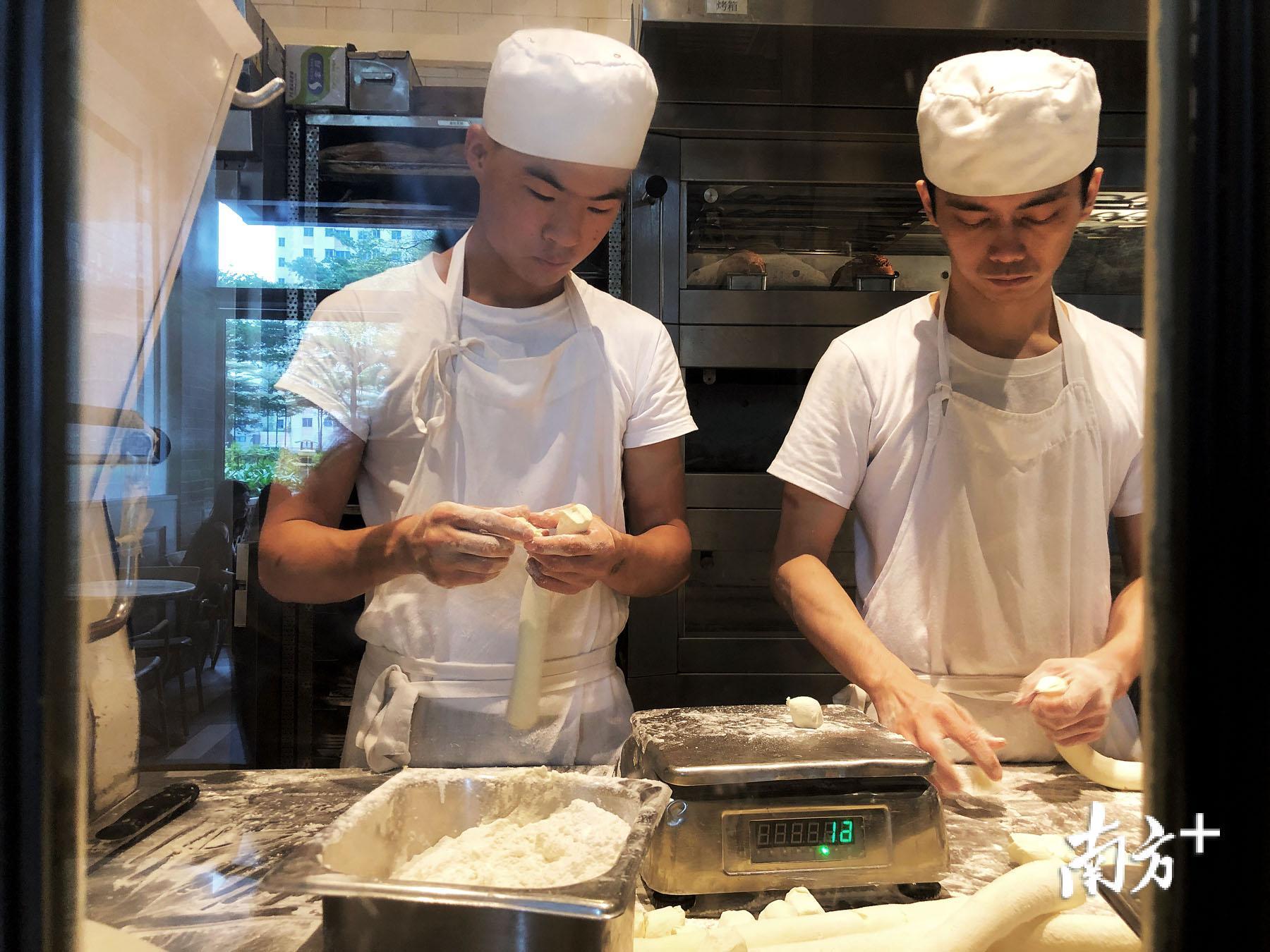 开放厨房,面包师傅在做面包。