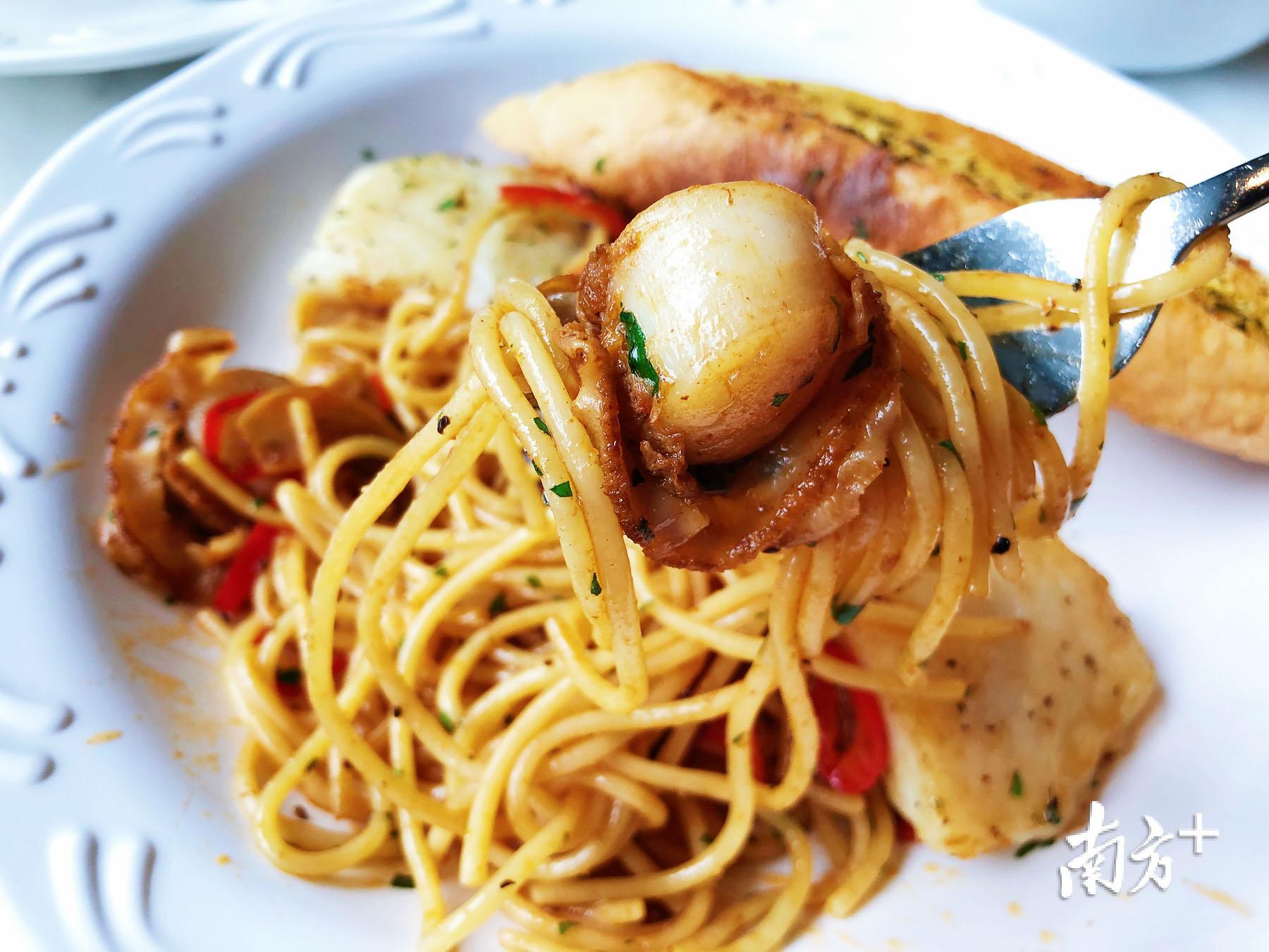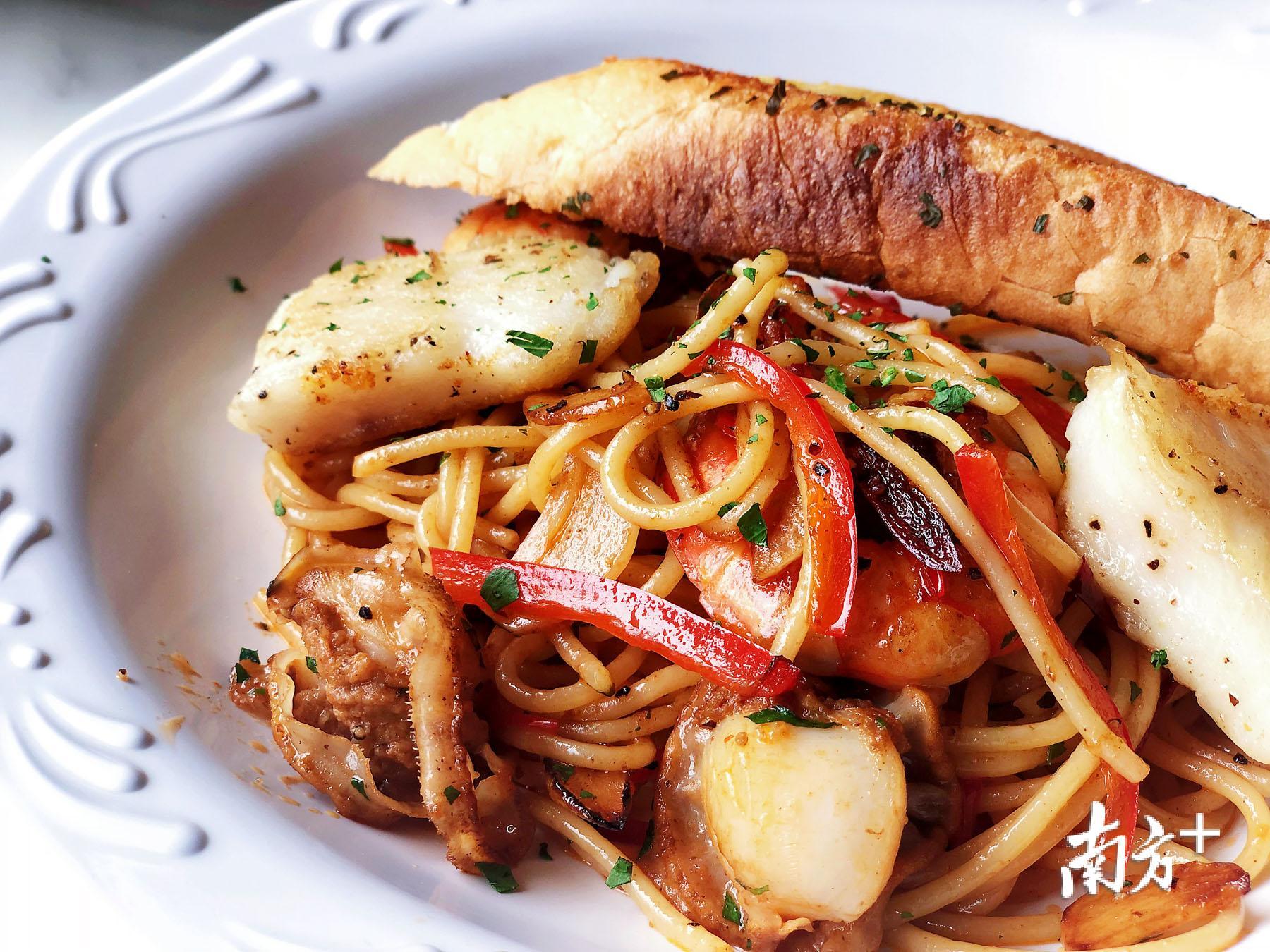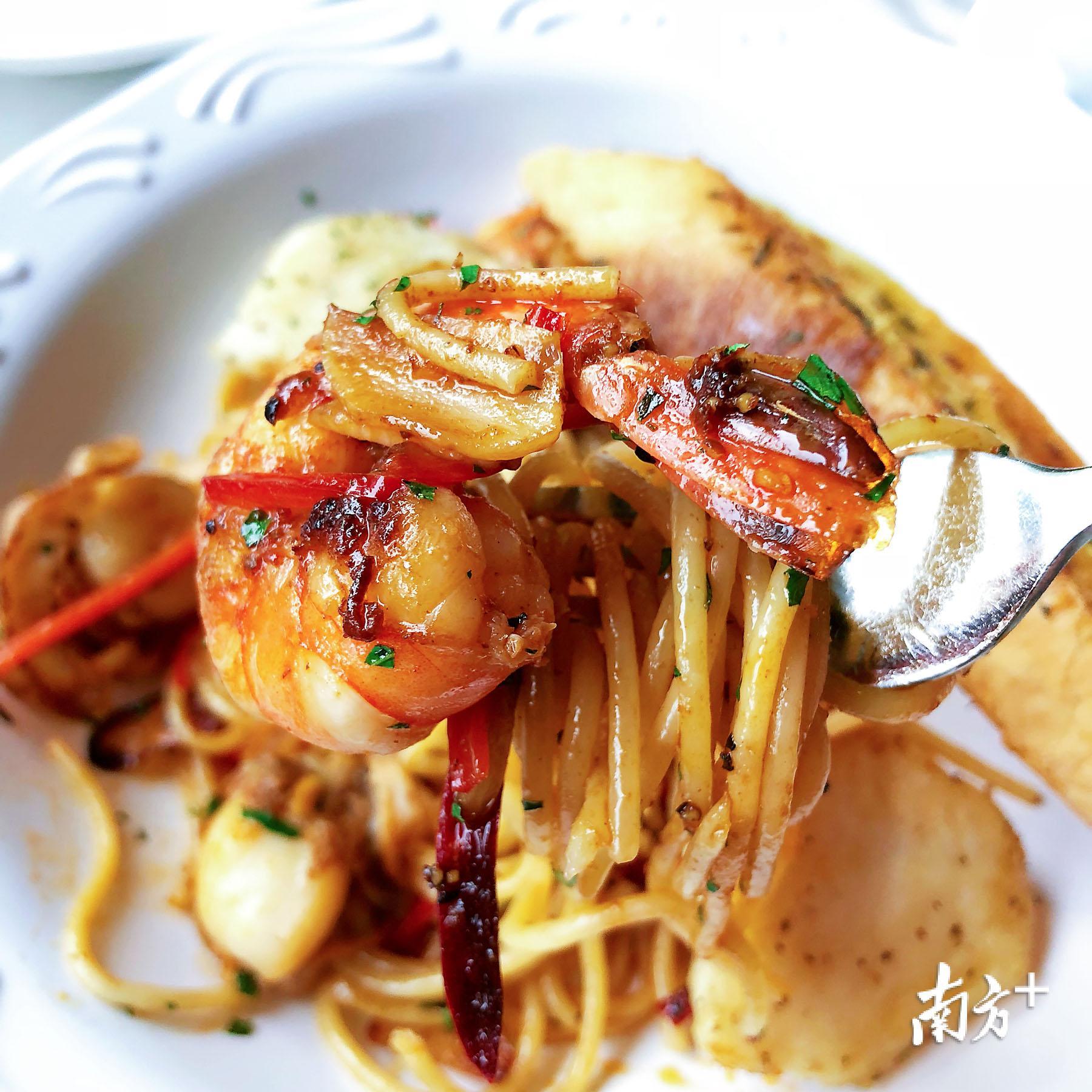 蒜辣海鲜意粉。