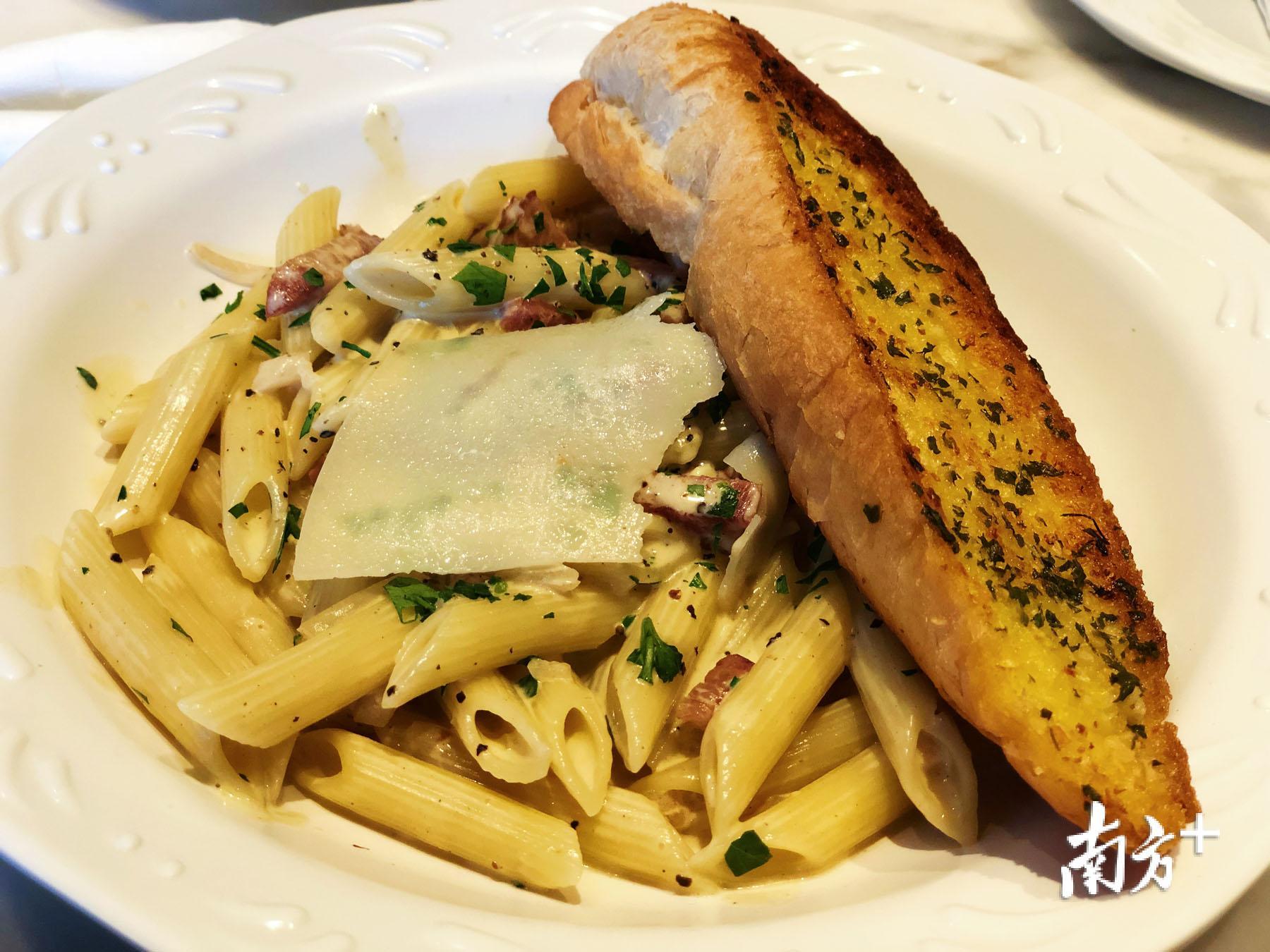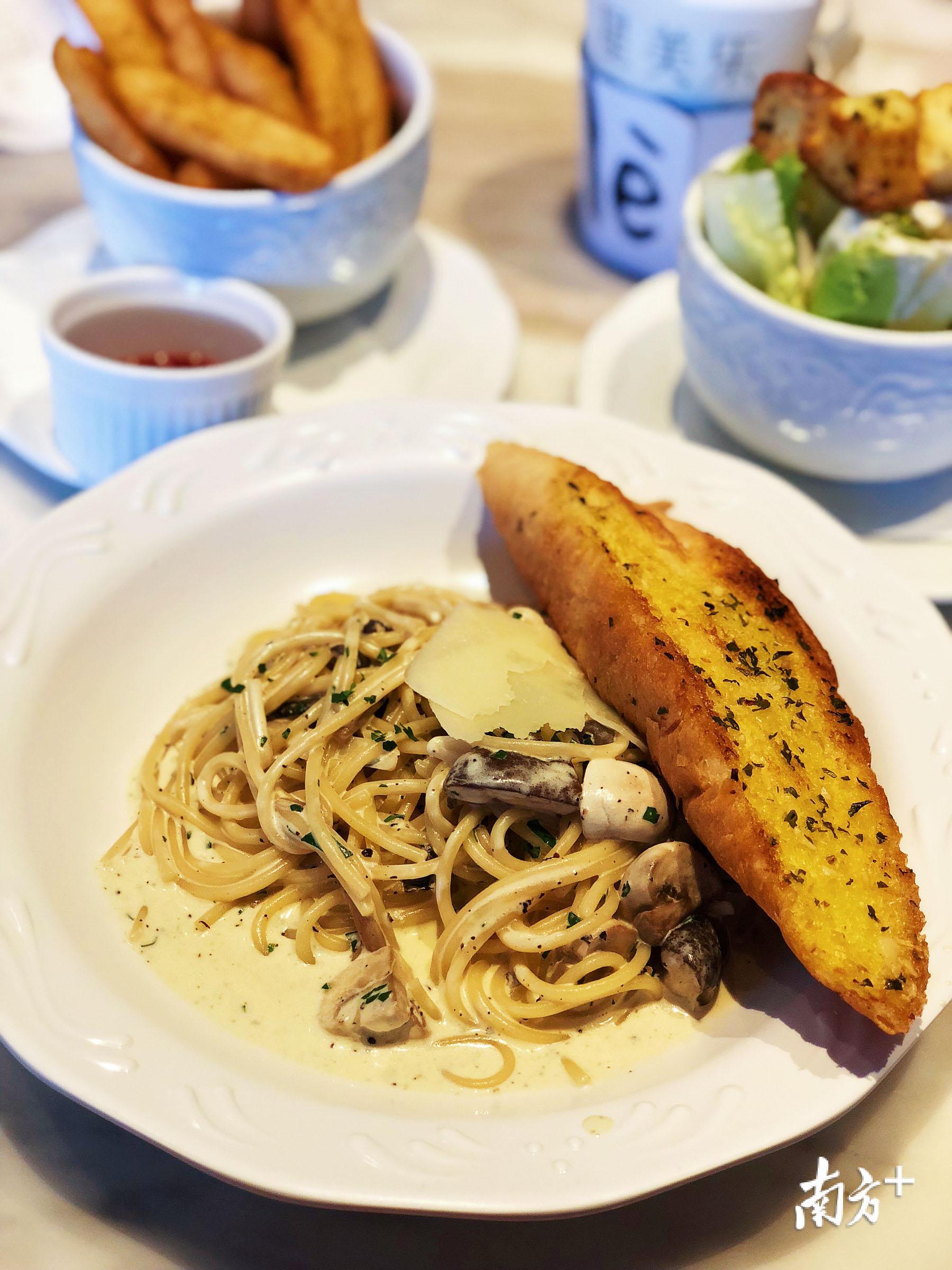 每次来到必点的松露汁野菌意粉,浓稠的松露奶油白汁加大片芝士配上法式蒜蓉面包,各种菌类混在酱汁里面,滋溜溜一碟下肚非常满足。
