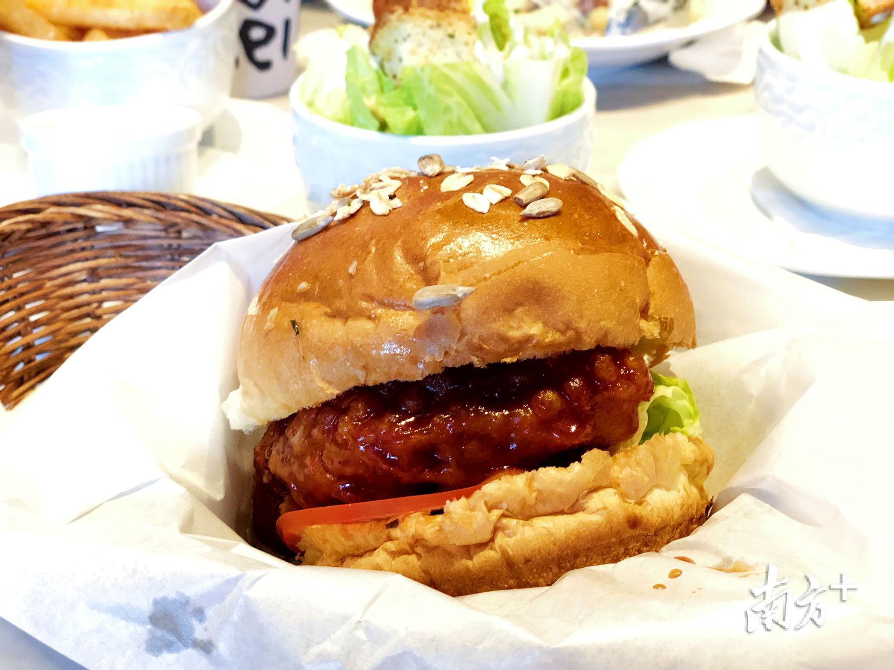 黑醋鸡汉堡,面包柔软,里面厚厚的酥皮鸡排,酱汁酸酸甜甜,调味刚刚好,拿起来因为料太足,要嘴巴足够大才能一口下去,满满的能量。