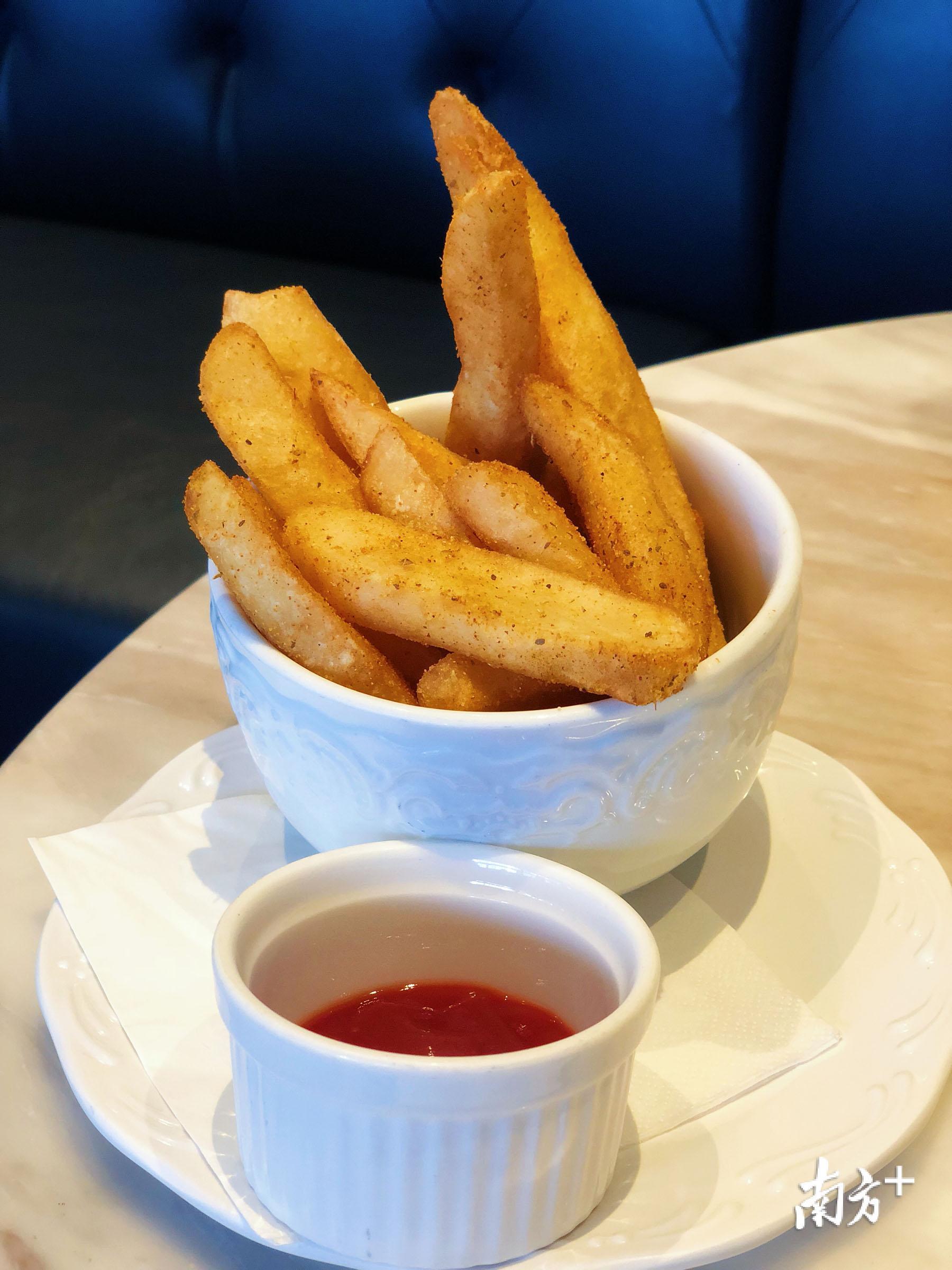 辣薯条,大大条的薯条上面一点辣椒和香料粉,微微的辣,外酥里软,很有口感。