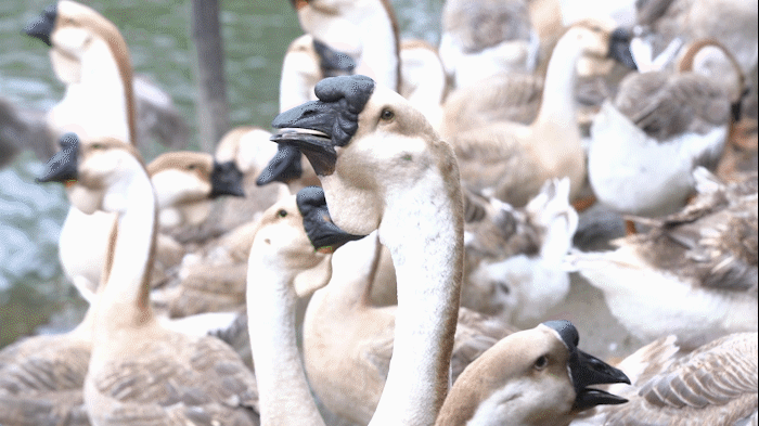 澄海狮头鹅体型巨大,最重可达18公斤,有“世界鹅王”的美誉,因为头部顶端和两侧具有较大肉瘤,形似狮头,故称狮头鹅。