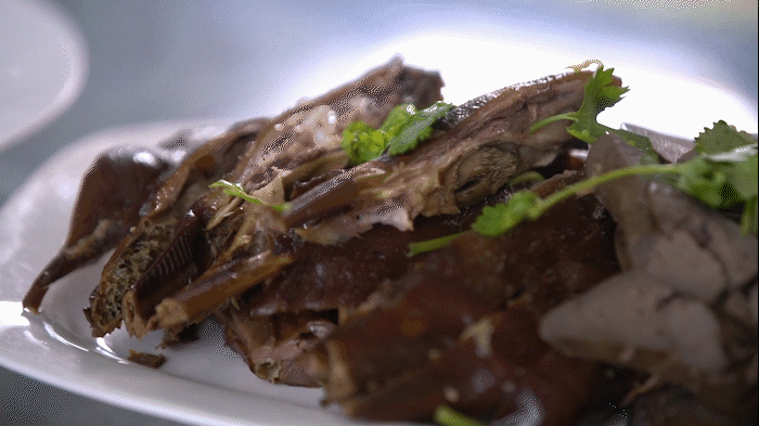 澄海狮头鹅制作过程十分讲究,腌制后要反复沉入锅中浸煮,富有经验的厨师会根据多年的卤鹅经验,控制不同部位的卤煮时间,保证卤鹅的外表颜色鲜亮,内部肉质肥美,一口咬下,鹅肉鲜香滑嫩,汁水充盈整个口腔,口感丰盈,香滑入味。