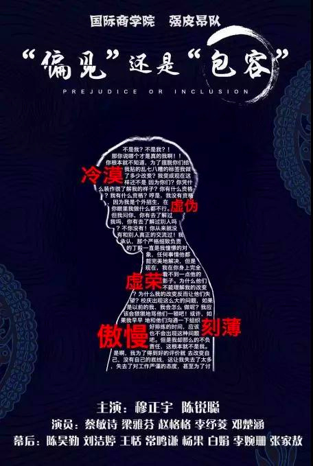 国际商学院《偏见?还是包容》中,主人公总是给别人贴上形形色色的标签,可当被贴标签的人换作是他,事情变得越来越糟。被他以偏见相看的同学,却用真心和包容唤回了他,一切又回到了正常的轨道。最终喜获三等奖和最佳海报奖。