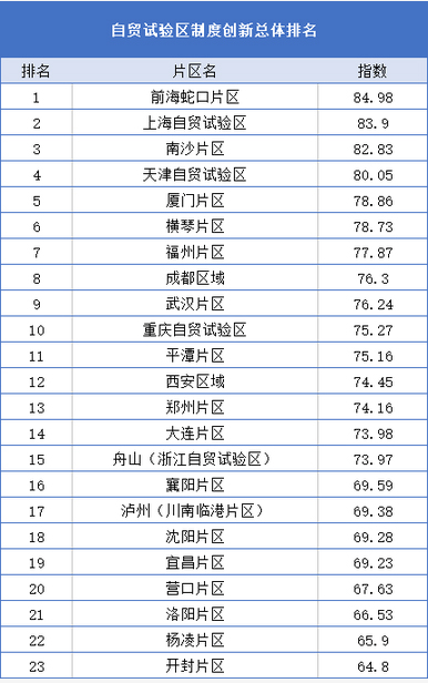 以中山大学自贸区综合研究院发布的“2017—2018年度中国自由贸易试验区制度创新指数”为例,全国23个自贸片区或区域(不含海南)制度创新总排名中,排在首位的前海蛇口自贸片区指数为84.98,与排名靠后的片区指数值相差约20。
