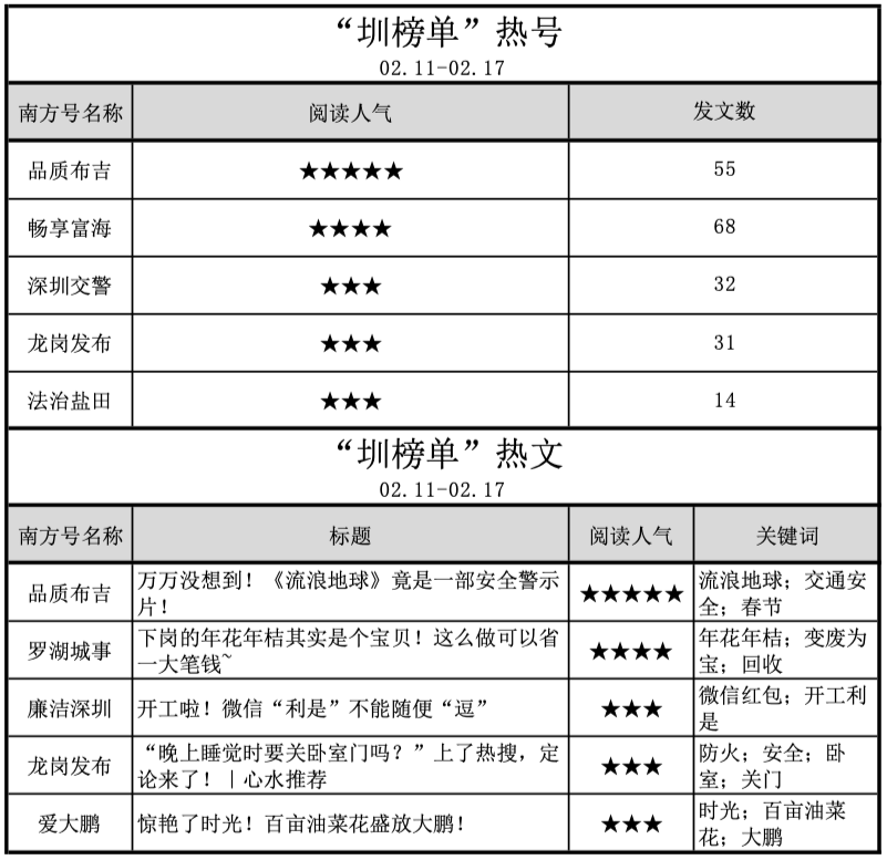 同时,深圳开年“利是”——覆盖10个区开展306场招聘会的“2019年春风行动”即将开始,南方号“深圳工会”“新时代新罗湖”“深圳南山司法”等多个南方号对此集中报道。