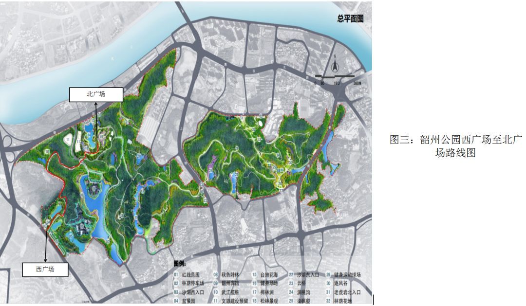 3、温馨提示:鉴于春节期间韶州公园北广场游客人数较多,停车位较为紧张,建议可将车辆停放置西广场停车场,再步行前往北广场,西广场至北广场路线图如图3。