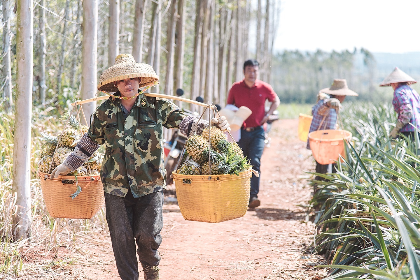 近日,徐闻县晴空万里,气温逐步上升,徐闻菠萝也迎来一波采收小高潮。南方农村报记者走访曲界镇菠萝种植田发现,不少大型货车停靠在菠萝田大路旁,工人们将农用车上的一筐筐菠萝搬上大货车。菠萝田里,工人们忙着采收、挑选和打包菠萝,呈现出一片农忙景象。