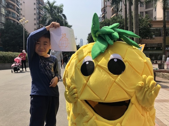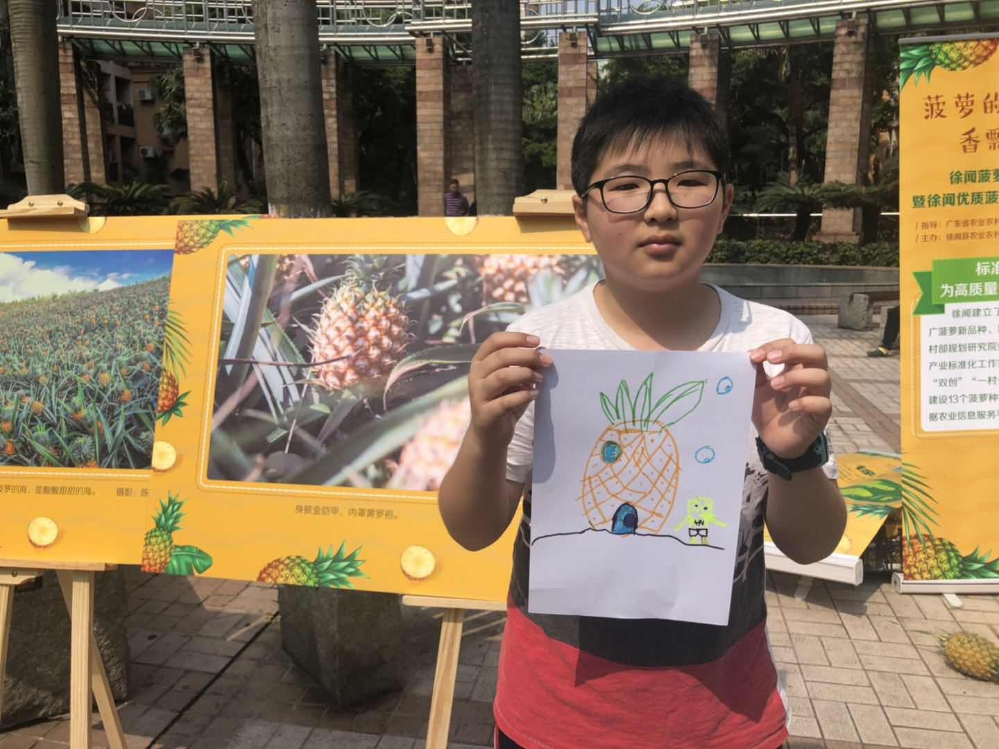 免费品鉴徐闻菠萝摊位火爆,一旁的“菠萝童年”游戏也十分火热,只要画出菠萝元素的图画,就可以获得一个菠萝的规则,让许多小朋友摩拳擦掌,想要好好表现一番,赢一个菠萝带回家。他们用画笔画出了自己心中的菠萝,有的是是一颗黄色的菠萝,有的是切好的菠萝,还有的画了海绵宝宝的菠萝房子……虽千奇百态,却充满着童真童趣,画完后还奶声奶气地说“我为徐闻菠萝代言”。