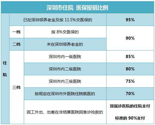 深圳医保分为一档、二档、三档,各档次的医保有不同的报销比例,具体详见下图: