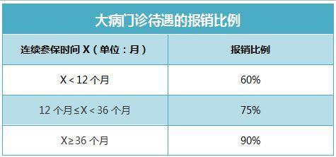 B. 大病医保支付标准:大病门诊待遇的参保人发生的医疗费用,报销比例与连续参保时间有关。具体如下图所示: