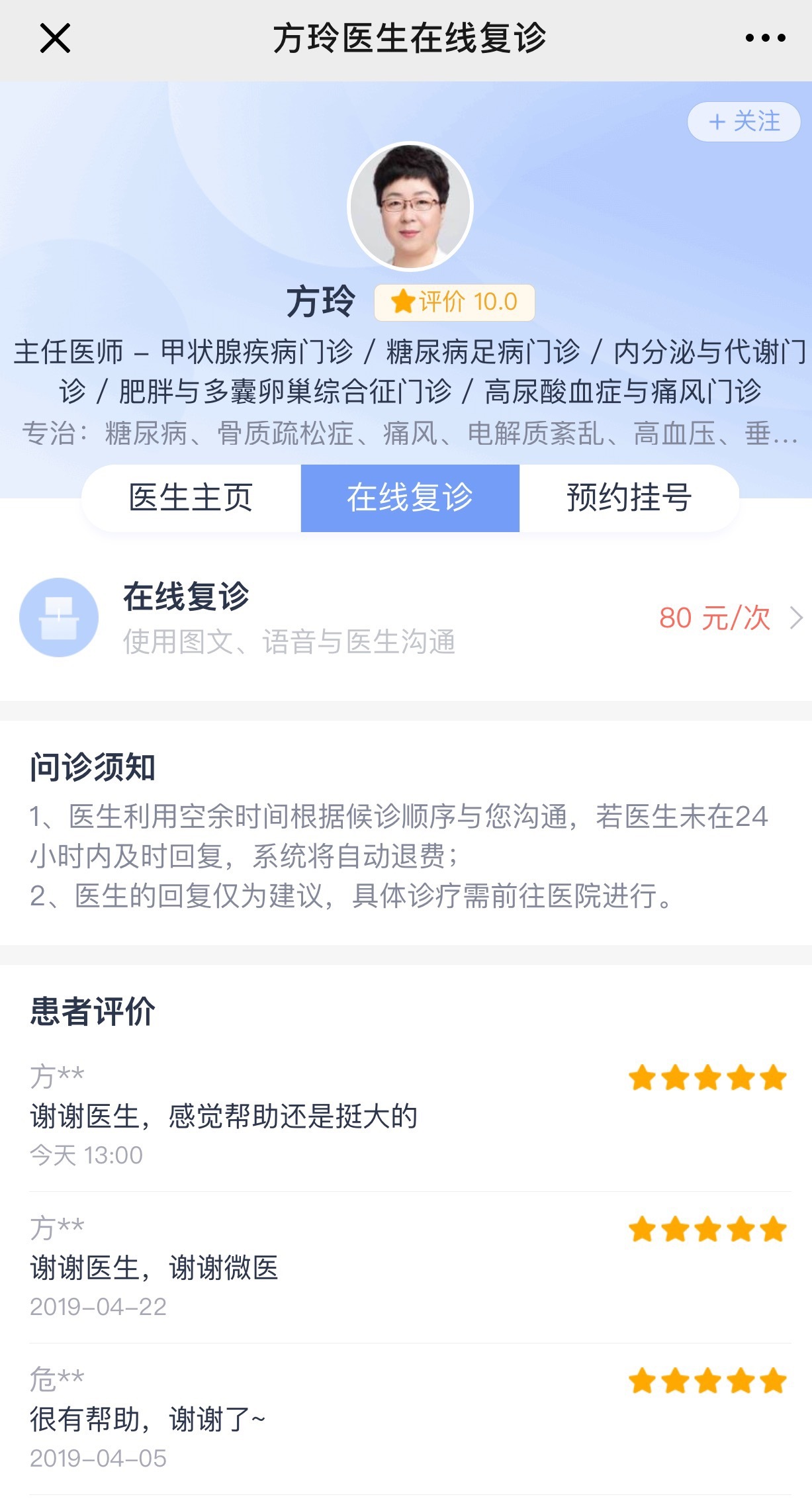 目前医院网络问诊的诊查费比线下门诊要稍微高一点。网络诊查费分为三个档次:主任医师80元/次,副主任医师60元/次,主治医师50元/次。而深圳三级公立医院的门诊,主任医师、副主任医师、普通门诊的诊查费分别是50元、33元和25元。在线复诊服务中,有的医生还没有提供网络问诊服务,而内分泌科、中医科的一些医生问诊量达到四五百人次,受到患者的欢迎。