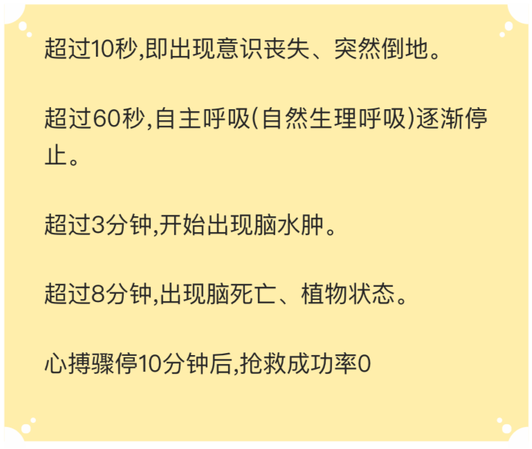 面对突如其来的意外,时间就是生命。人的心跳一旦停止,很快就会出现下列严重情况: