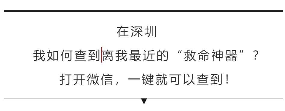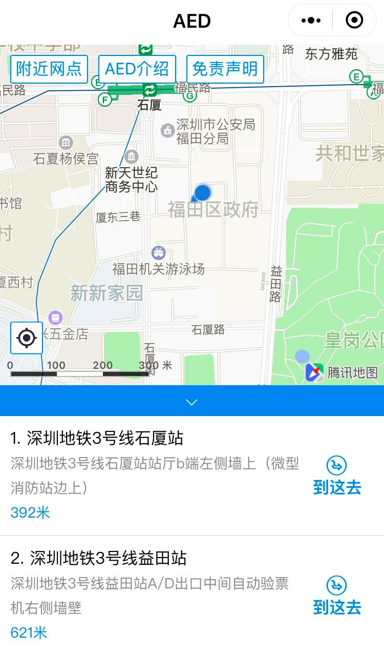 打开“腾讯地图”,或者深圳市急救中心联合腾讯发布的微信小程序“AED地图”,地图上立即会显示离你最近的AED。