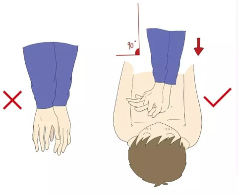 快速定位后,马上抽出一只手搭在另一只手的手背上,双手重叠并十指交叉、相扣,手臂绷直与病人胸部呈90°直角,垂直向下按压,不得倾斜,尤其肘关节不得弯曲。