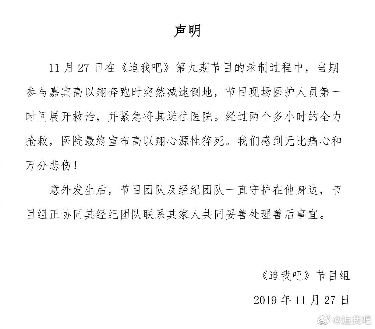 随后,其参与录制的浙江卫视《追我吧》节目组声明,高以翔为心源性猝死。