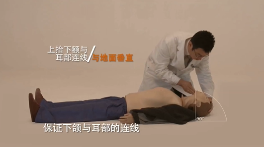 在为倒地者做徒手心肺复苏的同时,可采取“压头抬颏”法开放患者的气道,做法如下: