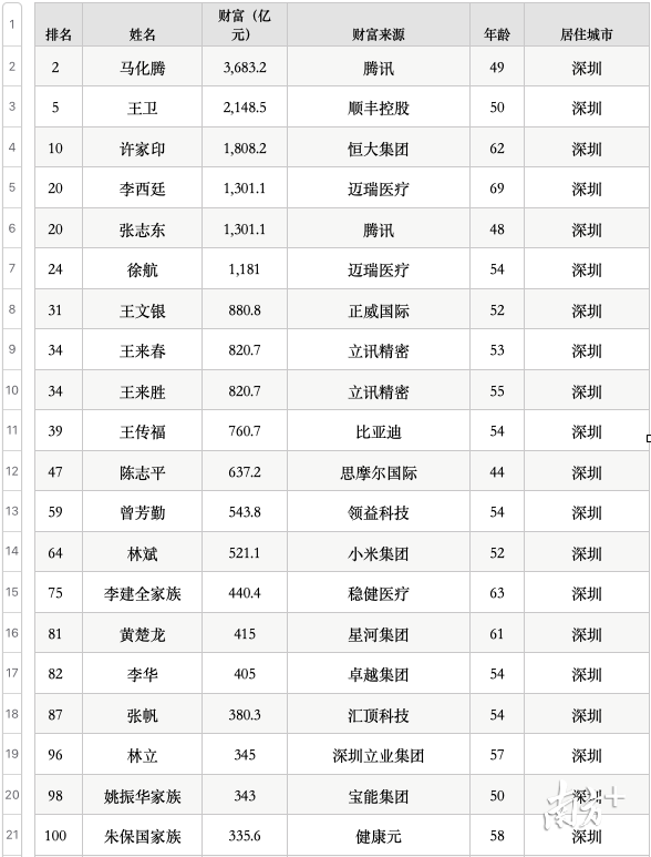 进入深圳榜单的房企有恒大、卓越、宝能、星河、京基、大中华国际、富源集团,其他主要是生物、科技公司和智能制造业企业。深圳榜单中,多名为首次入榜者。马化腾、王卫、许家印等前三位深圳富豪进入全国榜单top10。