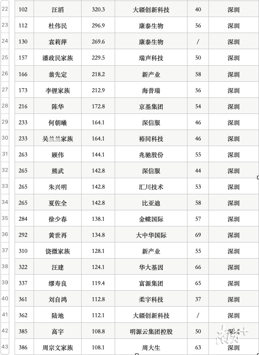 思摩尔国际在今年港交所上市之后,该公司与创始人陈志平走入公众视野,陈志平首次进入榜单,名列12位。而稳健医疗创始人李建全家族也因公司创业板上市进入公众视野,名列15位。另外还有新产业的翁先定、饶微家族,柔宇科技刘自鸿,明源云集团控股高宇。另外,康泰生物杜伟民因为离婚,其前妻袁莉萍也第一次进入榜单。