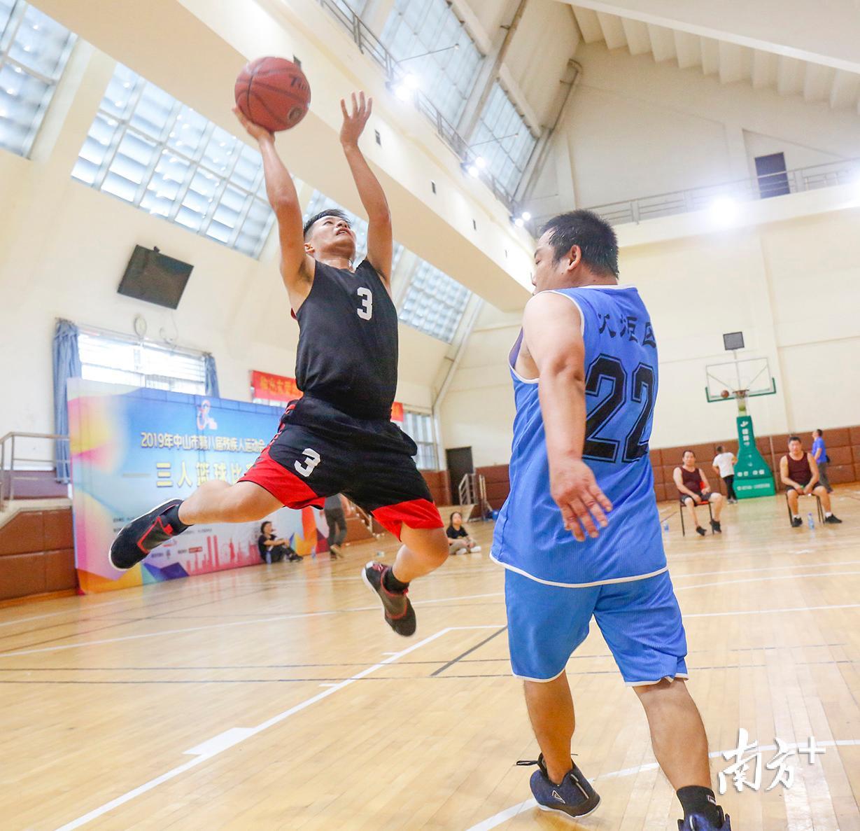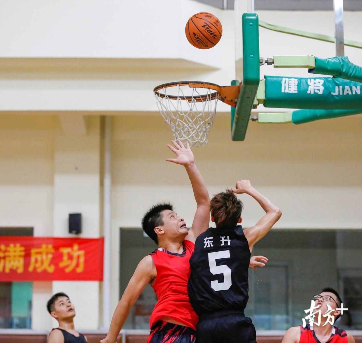 8月26日下午,篮球比赛现场,大涌镇代表队对东升镇代表队,大涌队队员高高跃起进行防守。