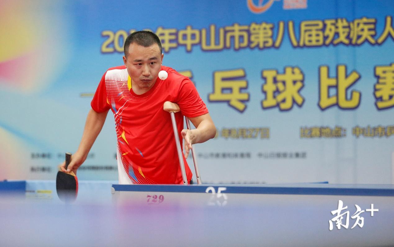 8月27日上午,乒乓球比赛现场,石岐区代表队的叶永斌在发球。叶永斌是中山市人民医院的一名博士后医生,因患小儿麻痹症而只能拄拐打球。